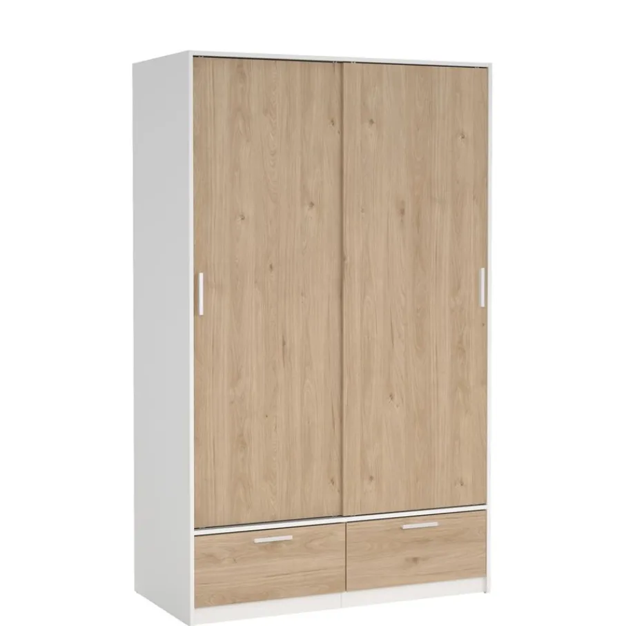 - Geef je slaapkamer een frisse en moderne uitstraling met deze prachtige kledingkast die licht en warmte samenbrengt dankzij de combinatie van wit en houtlook.