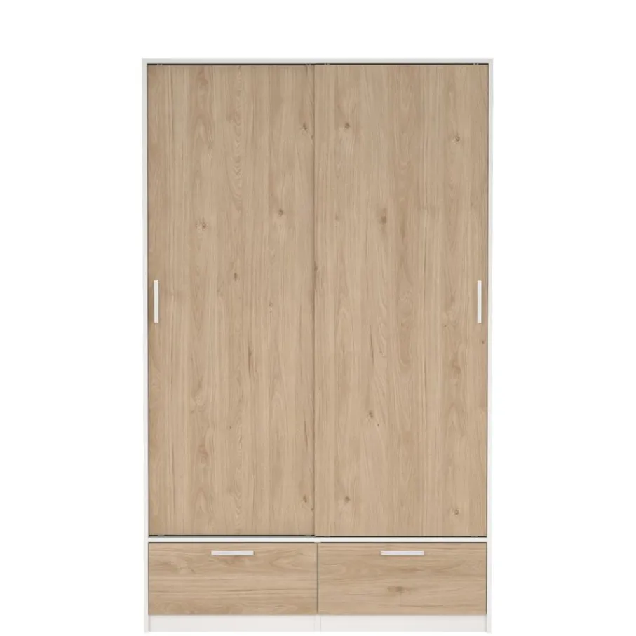 Deze Jasper kledingkast heeft 2 schuifdeuren met daarachter 2 smalle vakken met in ieder vak één plank en één roede. Aan de onderkant van de kast zitten 2 diepe lades met handige opbergruimte voor bijvoorbeeld sokken en ondergoed. De deuren en lades hebben kunststof grepen in matzwarte kleur.