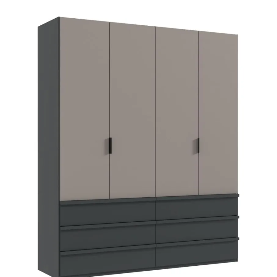 Kledingkast Rivas heeft handige vouwdeuren, waarmee je eenvoudig toegang hebt tot je garderobe. Binnenin vind je twee legplanken en twee roedes om je kleding perfect te organiseren. Aan de onderkant van de kast zitten 6 lades met veel handige opbergruimte.
