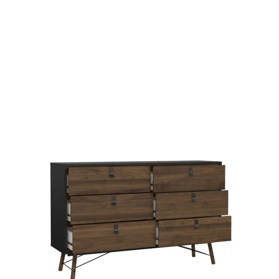 De Denver dubbele ladekast heeft zes brede lades met ruime opbergmogelijkheid. Met stalen kogellagers schuiven de lades moeiteloos open en dicht. De metalen handgrepen op de lades zorgen voor een speels accent.