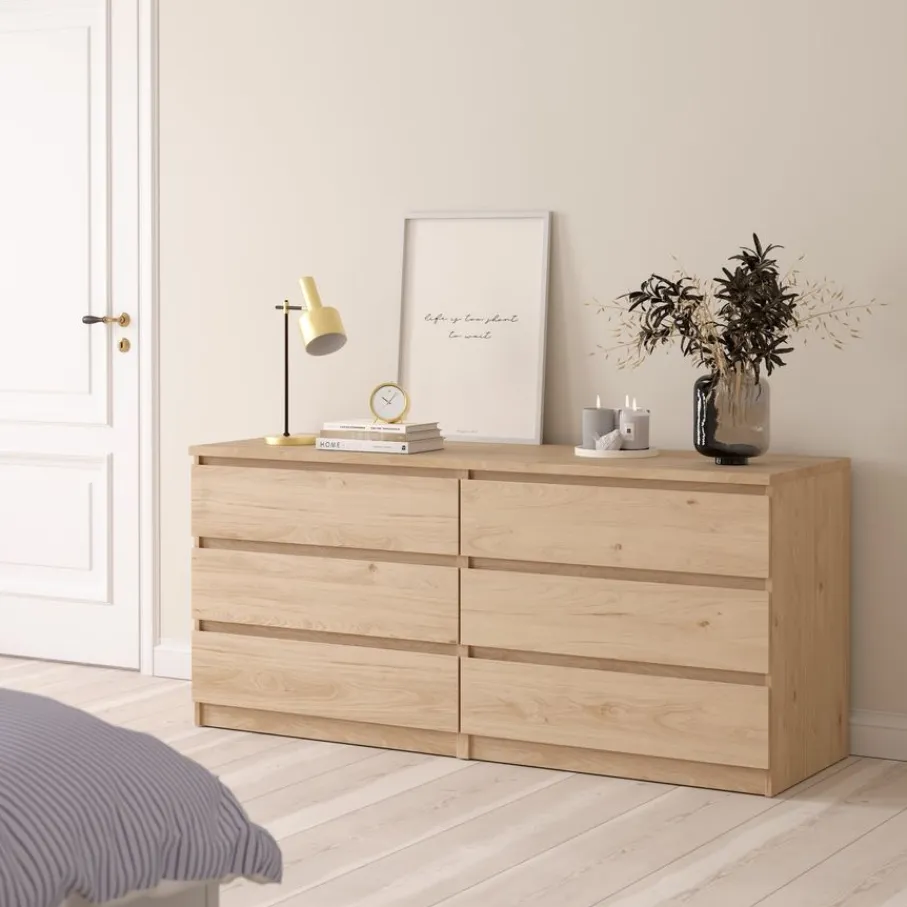 Deze ladekast heeft 6 ruime lades, perfect om van alles en nog wat netjes op te bergen. Ze hebben aan afmeting van 70×43 cm en zijn 12 cm diep. De greeploze lades lopen op metalen geleiders, zodat ze soepel openen en sluiten.