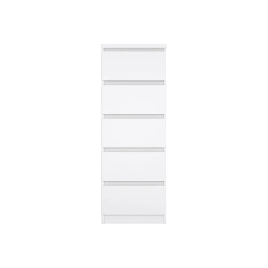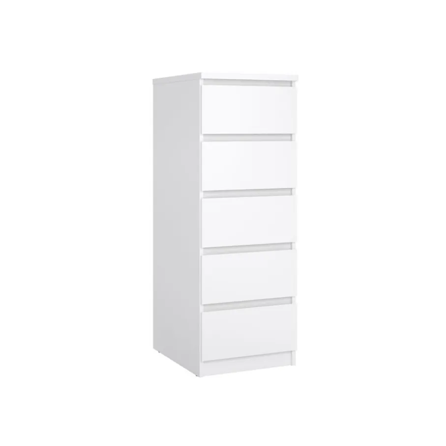 Deze hoge ladekast heeft 5 lades, perfect om van alles en nog wat netjes op te bergen. Ze hebben aan afmeting van 34×43 cm en zijn 12 cm diep. De greeploze lades lopen op metalen geleiders, zodat ze soepel openen en sluiten.