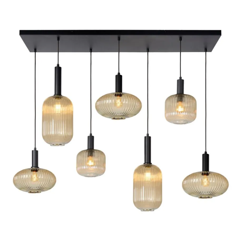 - Met 7 glazen kappen is deze hanglamp een ware blikvanger, wat betekent dat hij het beste tot zijn recht komt in een ruimte waar hij echt de aandacht kan pakken.