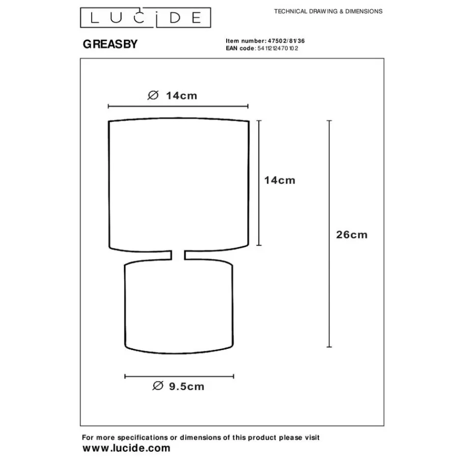 In tafellamp Greasby gaat een lichtbron met een kleine fitting type E14, van maximaal 40 watt. Deze wordt niet meegeleverd. Om je lamp compleet te maken, vergeet dan niet om er de juiste lichtbron bij aan te schaffen.
