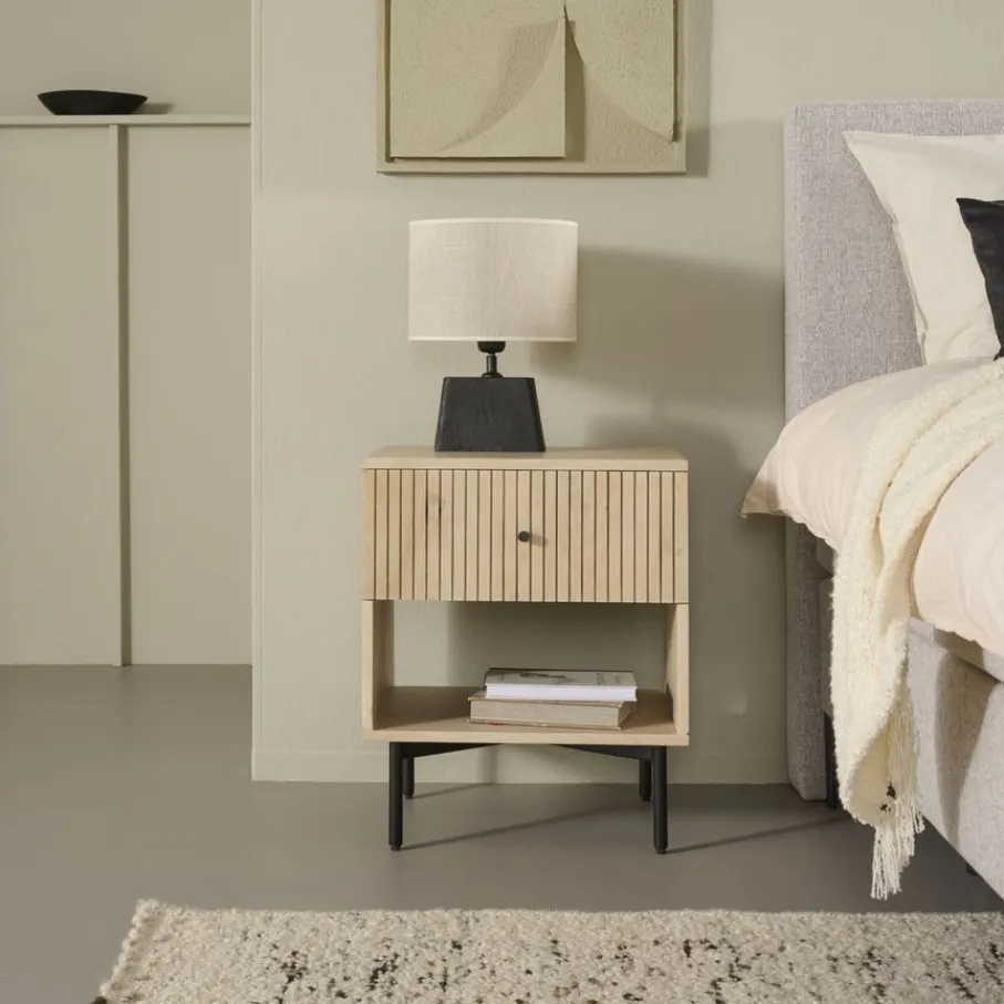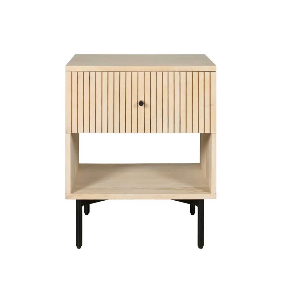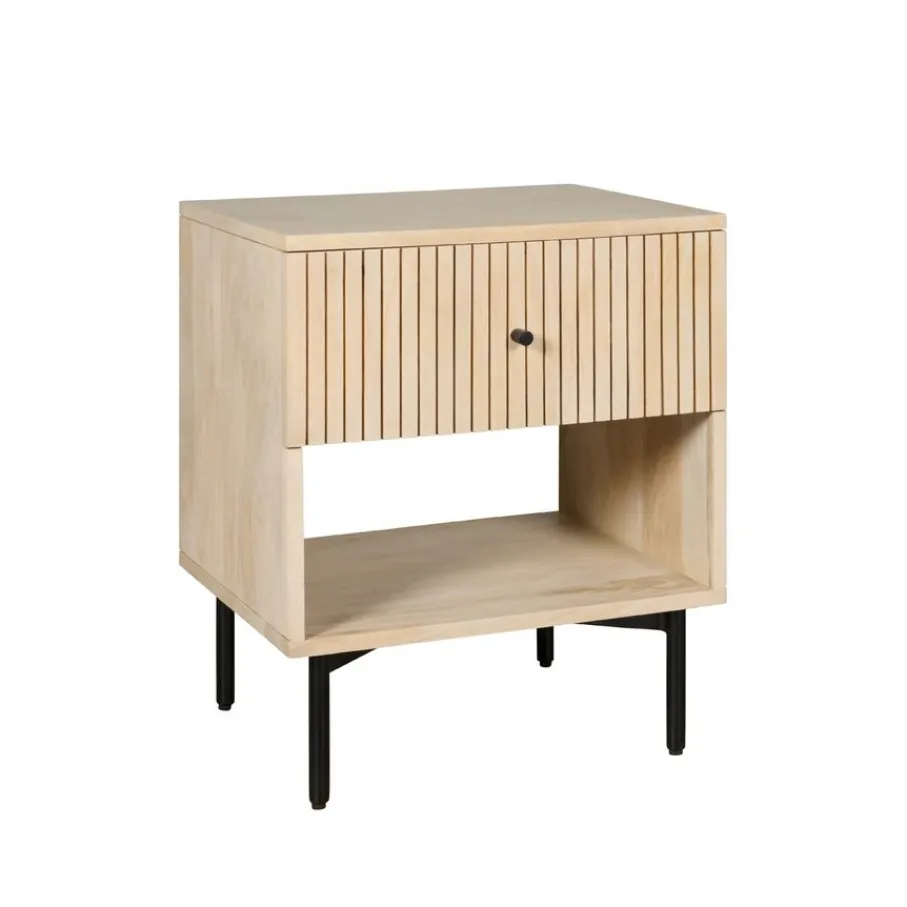 - Een unieke blikvanger: Dit nachtkastje heeft een prachtige, lichte finish van mangohout en een speels lijnenspel op de lade, een echt design statement voor je huis.