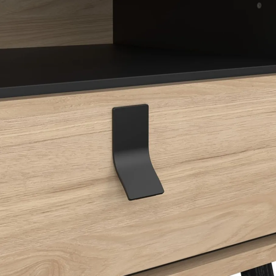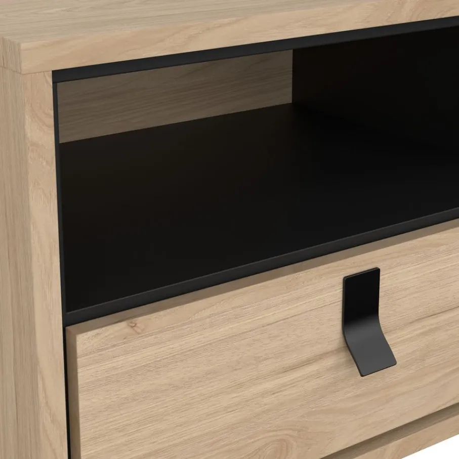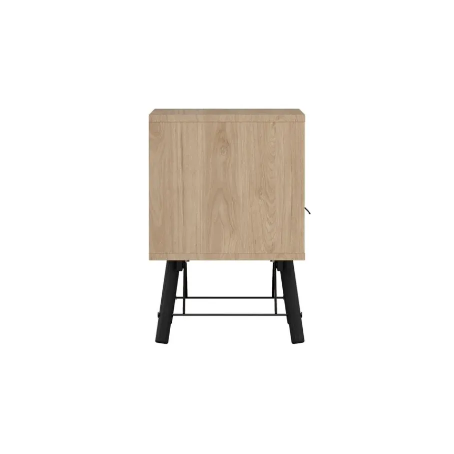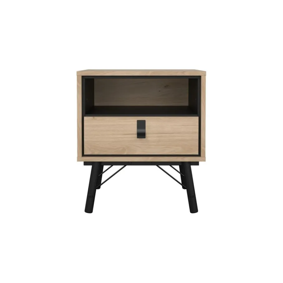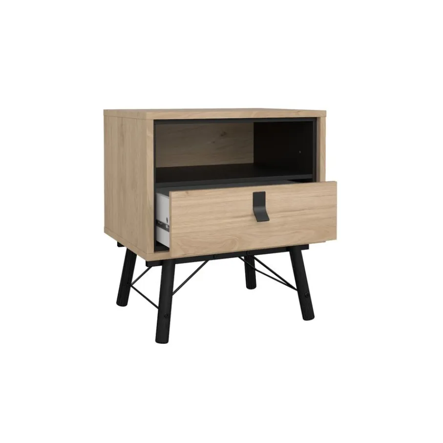 Het nachtkastje heeft bovenin een open vak, met daaronder een lade. Het biedt praktische opbergruimte voor alles wat je dichtbij je bed wilt hebben. De lade heeft een speelse vorm handgreep van zwart metaal.
