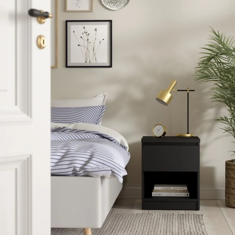 Met een compact formaat en praktische opbergmogelijkheden past nachtkastje Luna moeiteloos naast elk bed. Dit kastje combineert een handige lade met een open vak. De lade opent soepel door de kogel gelagerde geleiders en het open gedeelte is perfect voor je favoriete boeken of accessoires.