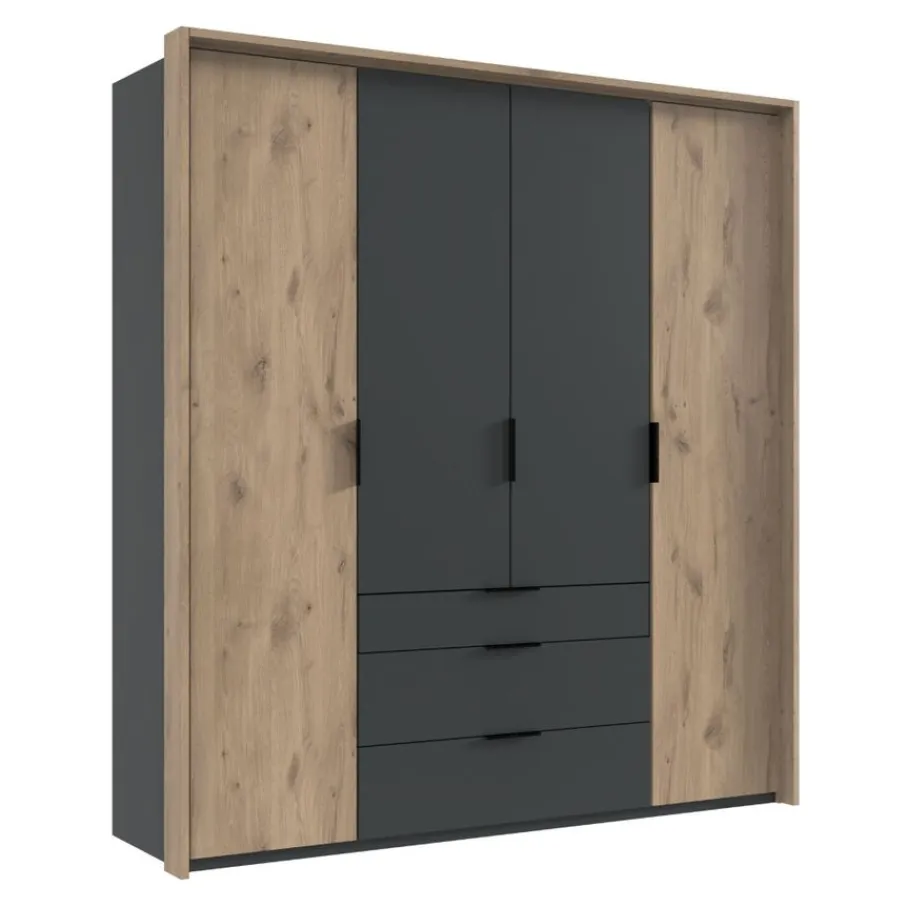 Let op: het gaat hier alleen om de omlijsting die past op kledingkast Almera. Deze passepartout heeft dezelfde robuuste houtlook en geeft een complete en luxe look aan de draaideurkast. De omlijsting maakt de kast in totaal 204 cm breed en 220 cm hoog. De passepartout moet nog gemonteerd worden.