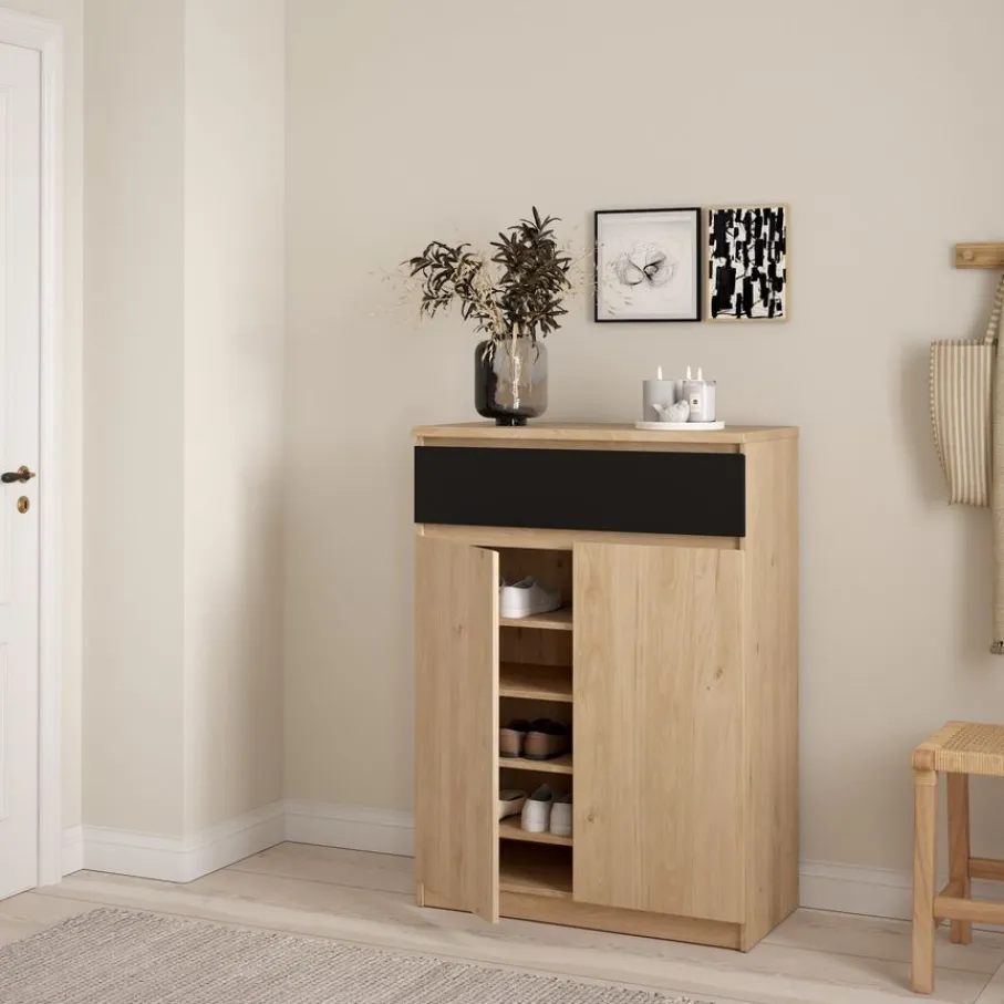 - Creëer direct rust in huis! Met z’n strakke design en handige afgeschuinde handgrepen geeft deze schoenenkast jouw entree een moderne, minimalistische look.