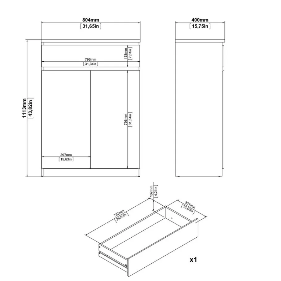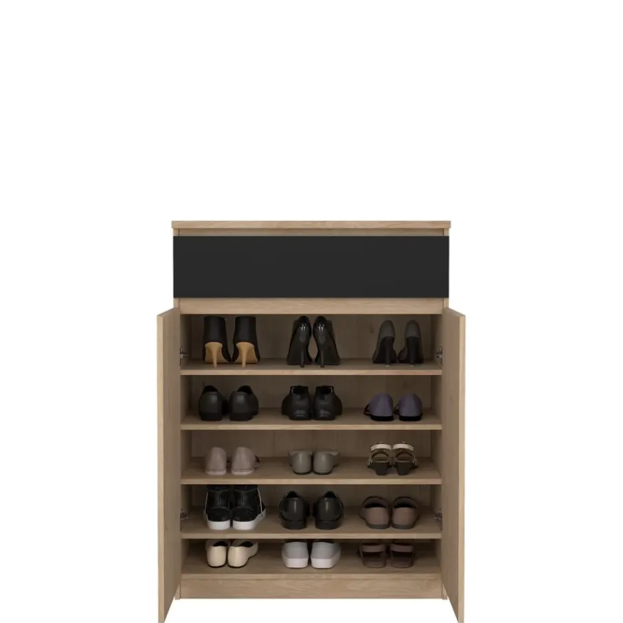 De Luna schoenenkast heeft een ruim vak met vier planken. Daarboven zit, over de hele breedte, een lade op soepele geleiders.
