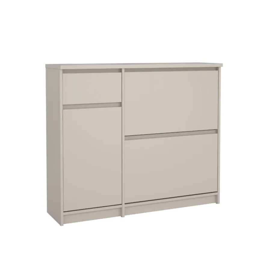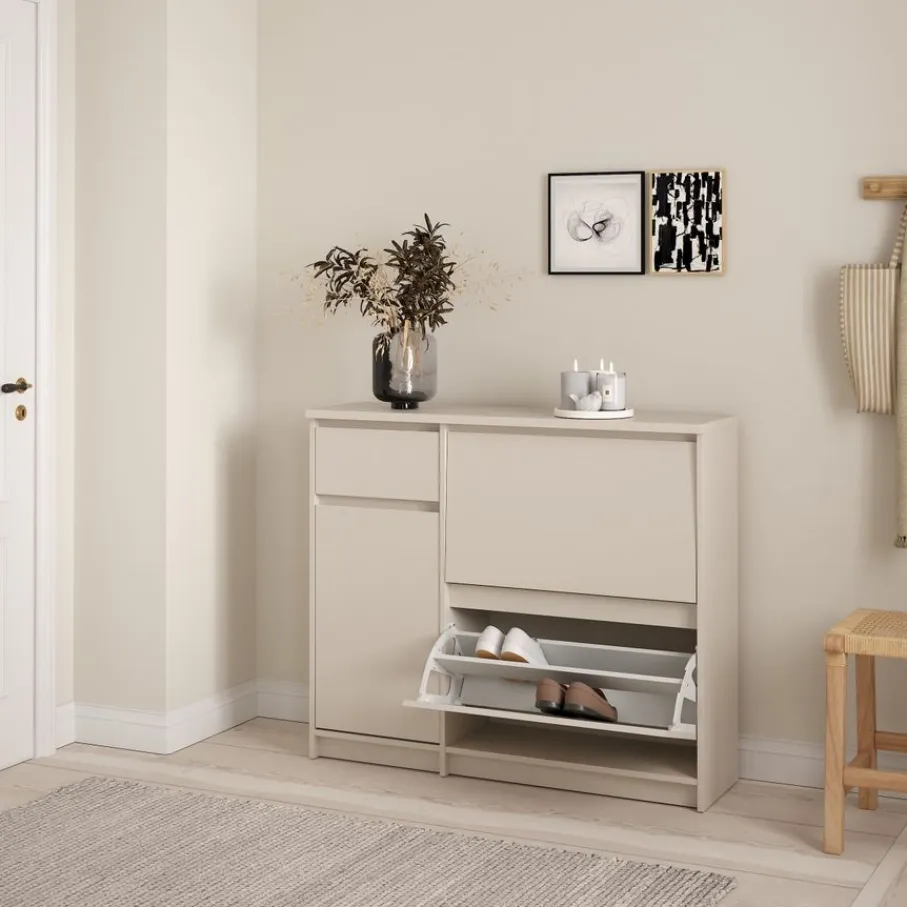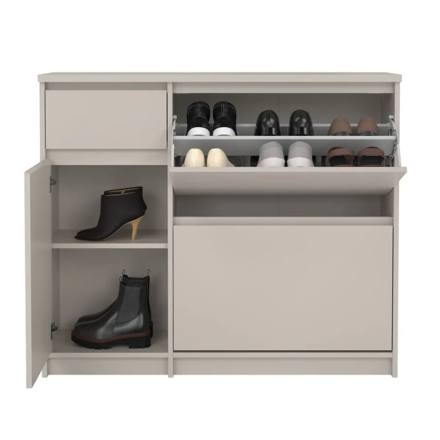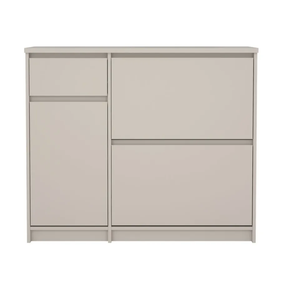 De Luna opbergkast heeft aan de linkerkant een lade met daaronder een vak met een draaideur. In dit vak zit een plank die zorgt voor vakverdeling. Rechts zijn er twee kleppen boven elkaar, met plaats voor meerdere paren schoenen schoenen.