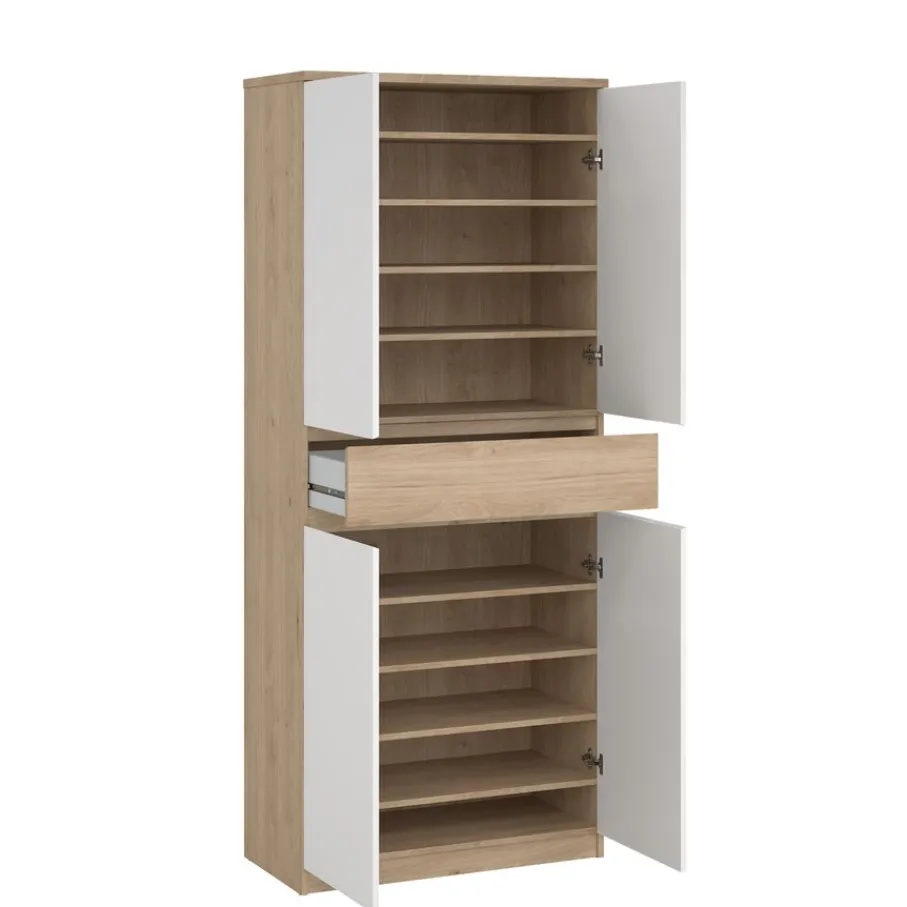 Schoenenkast Luna met twee deuren en handige lade biedt praktische opberg mogelijkheden. Boven en onder de lade zit een ruim vak met plek voor schoenen en dergelijke. Elk vak heeft er één vaste en drie verstelbare legplanken in. De kast wordt dus geleverd inclusief 8 planken.