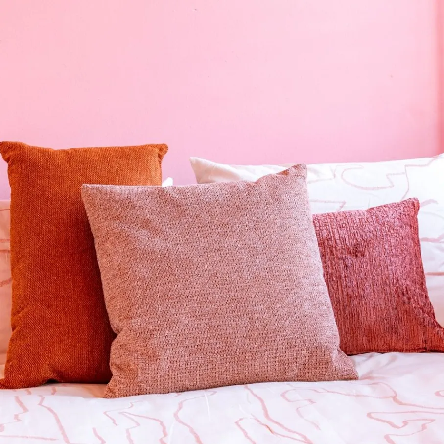 Sierkussen Miton is 45x 45 cm. Het is gemaakt van 90% polyester en 10% nylon in een oud roze kleur. De hoes heeft een ritssluiting en kan je wassen op een temperatuur van 30 graden.