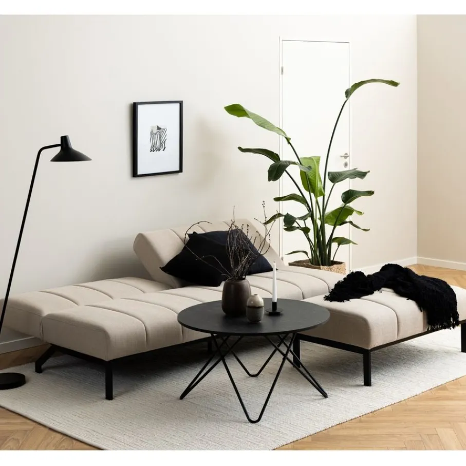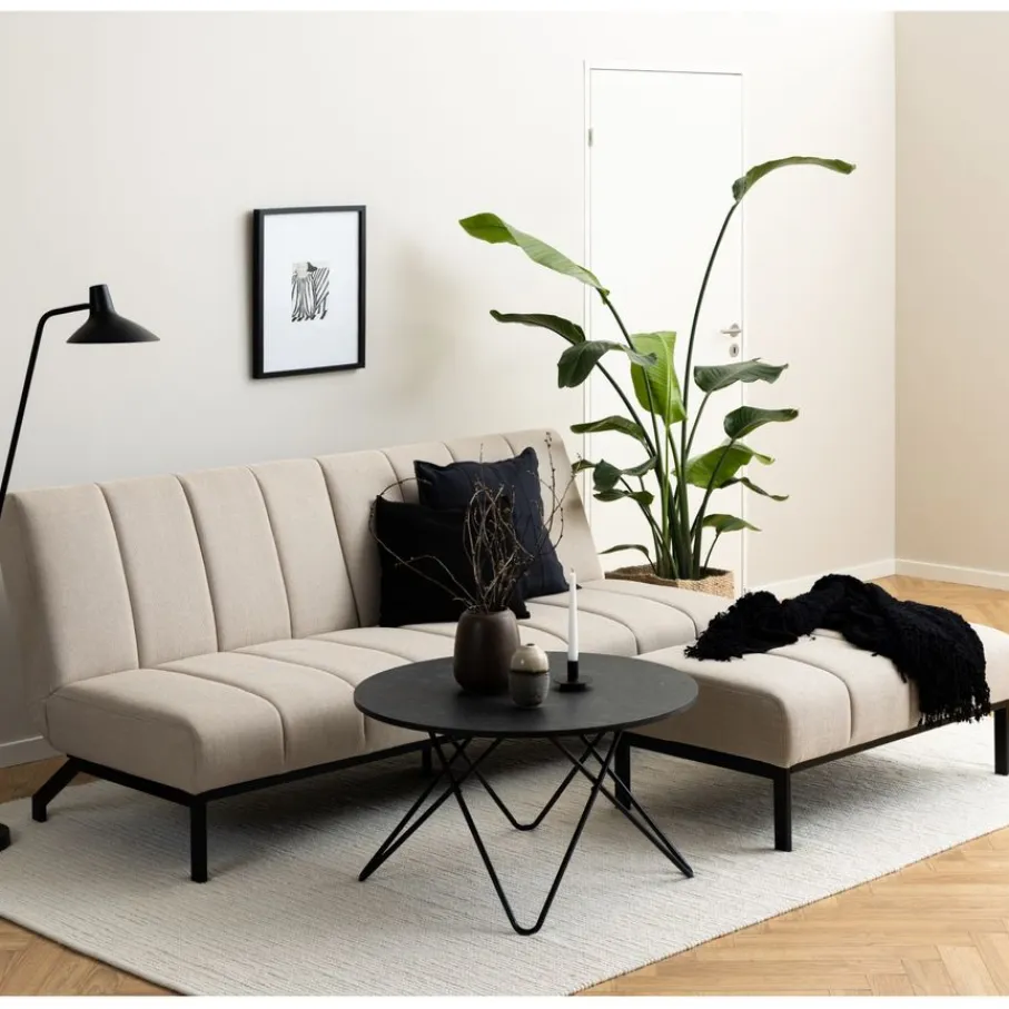 De Inez slaapbank is bekleed met stof Basel, een materiaal met een mooie geweven structuur. Een slijtvaste en sterke stof van 100% polyester. De beige kleur is elegant en stijlvol en combineert makkelijk.