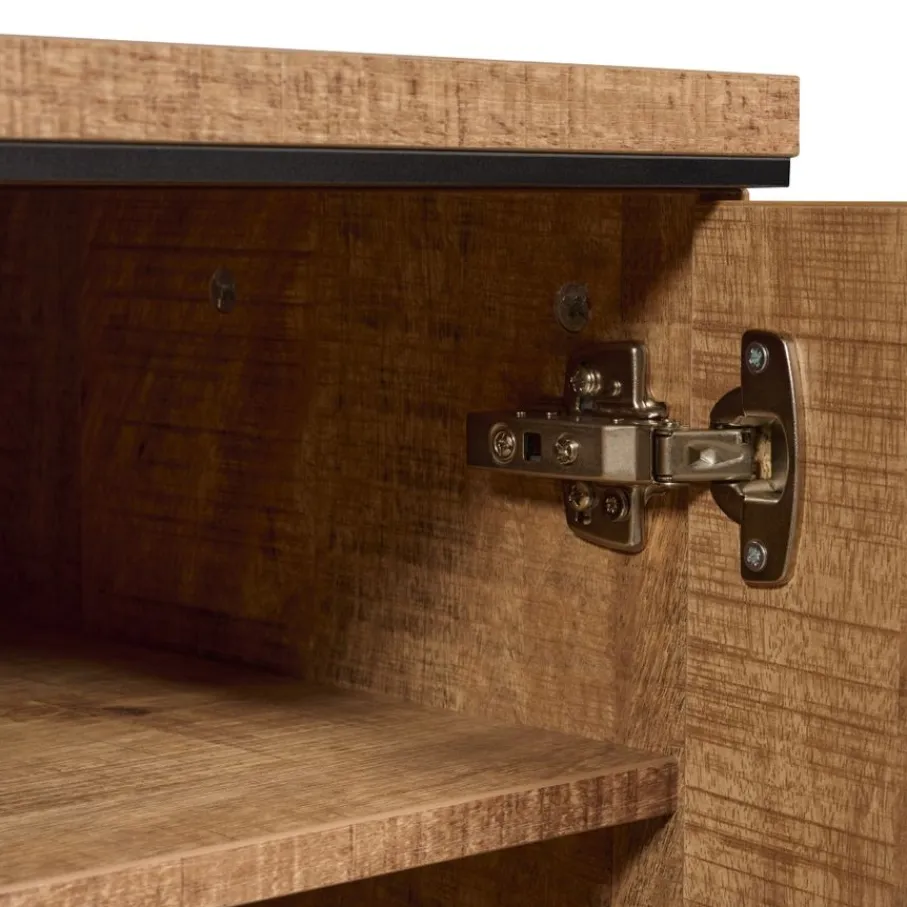 Het tv meubel heeft links en rechts een vak met een deur ervoor. In het midden zit een open vak met een lade eronder. De deuren en lade zijn voorzien van softclose, hierdoor sluiten ze zacht en soepel. Ze hebben zwart metalen handgrepen.