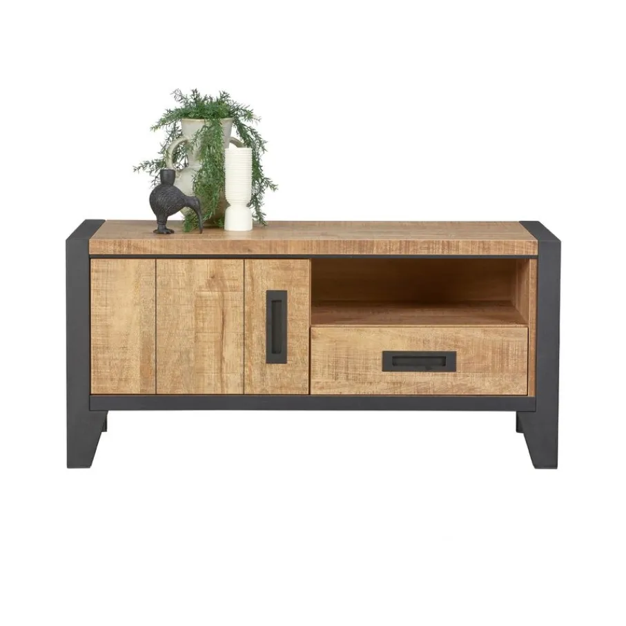 - Geef je interieur een stoere én warme boost met dit trendy tv-meubel, dat door de robuuste houtlook en het zwarte metaal moeiteloos in diverse woonstijlen past.
