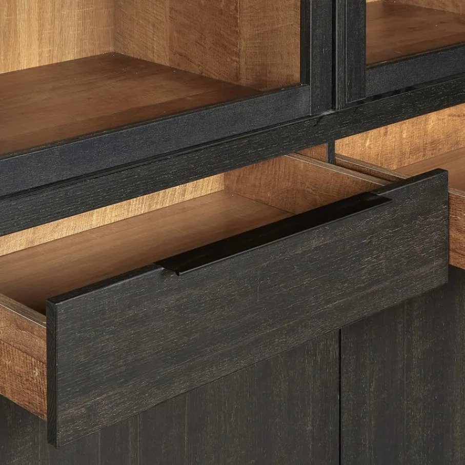 - Combineer show en opbergruimte: in de vitrinegedeelten met sfeervolle kastverlichting laat je jouw mooiste servies of dierbare herinneringen schitteren, terwijl je achter de dichte deuren en in de lades al je andere spullen netjes uit het zicht houdt.