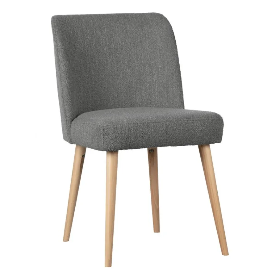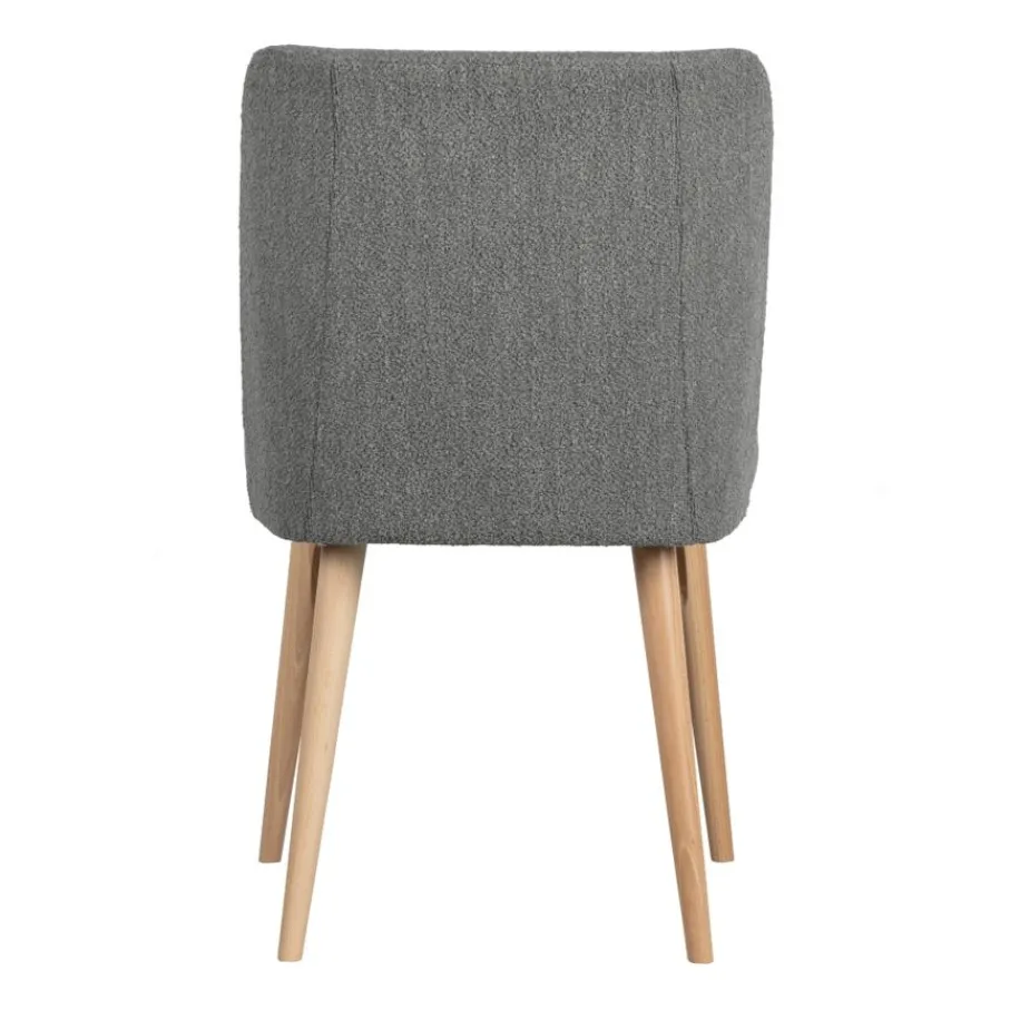 - Zachte staalgrijze bouclé en beukenhouten poten