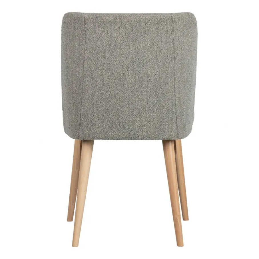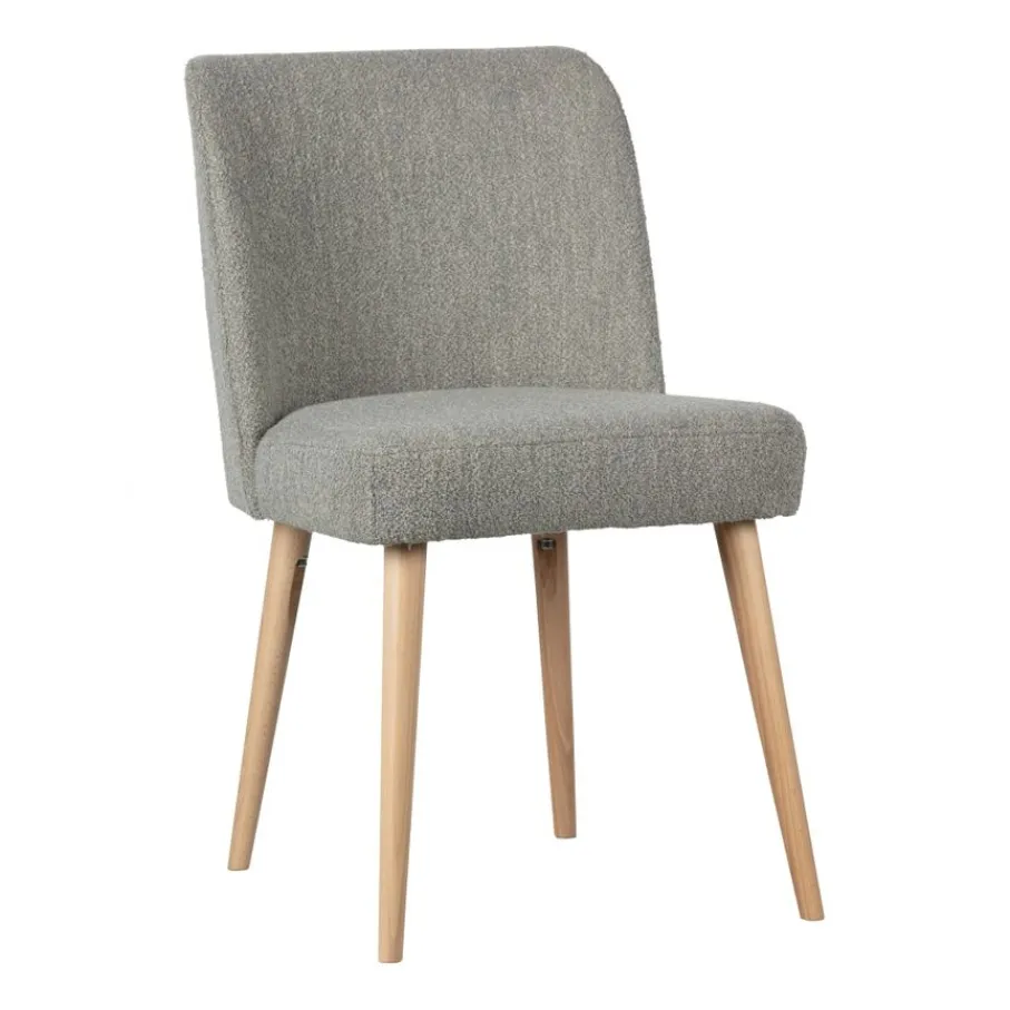 - Zachte lichtgrijze bouclé en beukenhouten poten