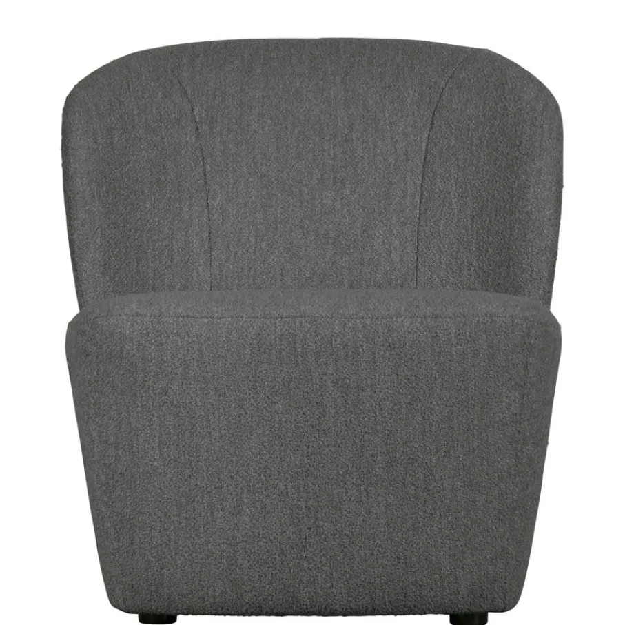 De fauteuil is gestoffeerd met een zachte bouclé stof in een staalgrijze kleur. Deze sterke stof is gemaakt van een mix van 96% polyester en 4% polyacryl en is geschikt voor intensief woongebruik.