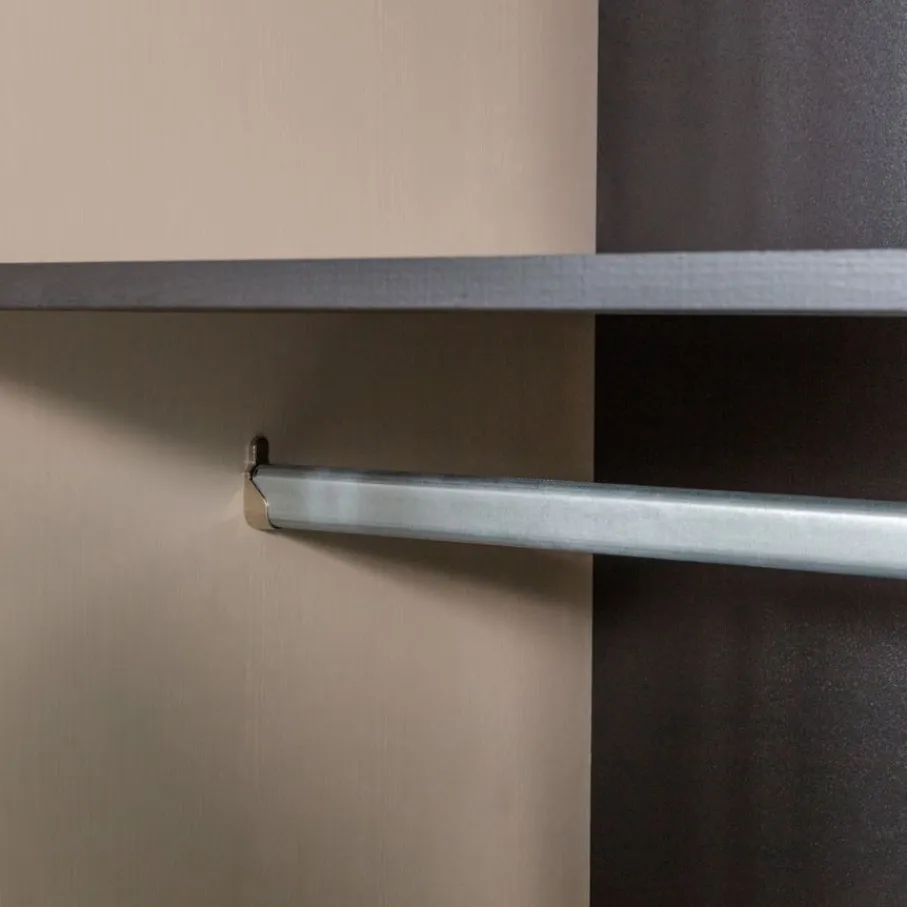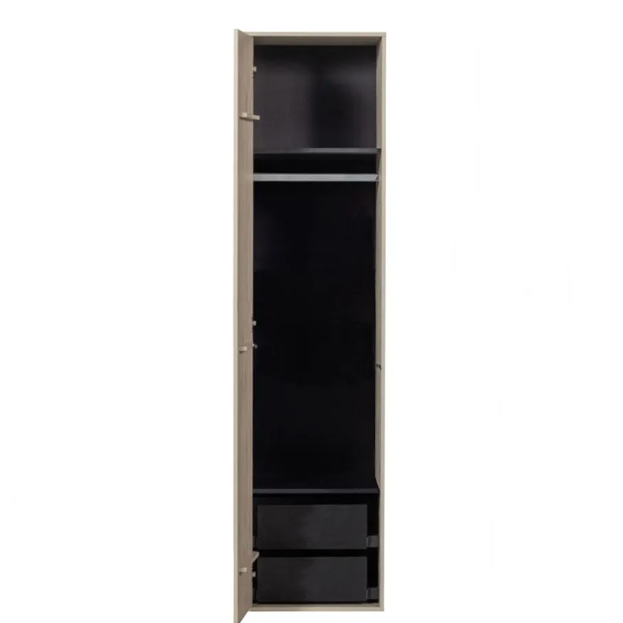 Kast Daily heeft een zwarte binnenkant en interieur. De enkeldeurs kast wordt met een compleet interieur geleverd. Daardoor is er een vak bovenin van 38 cm hoog. Daaronder zit een roede voor hangkleding. Onderin zitten 2 handige lades. Deze lades zijn 40 cm breed, 50 cm diep en 12 cm hoog. De plank heeft een draaggewicht van 15 kg. De greeploze deur is voorzien van een push-to-open systeem. Bij deze Daily kast kun je planken van 50 cm aan het interieur toevoegen.