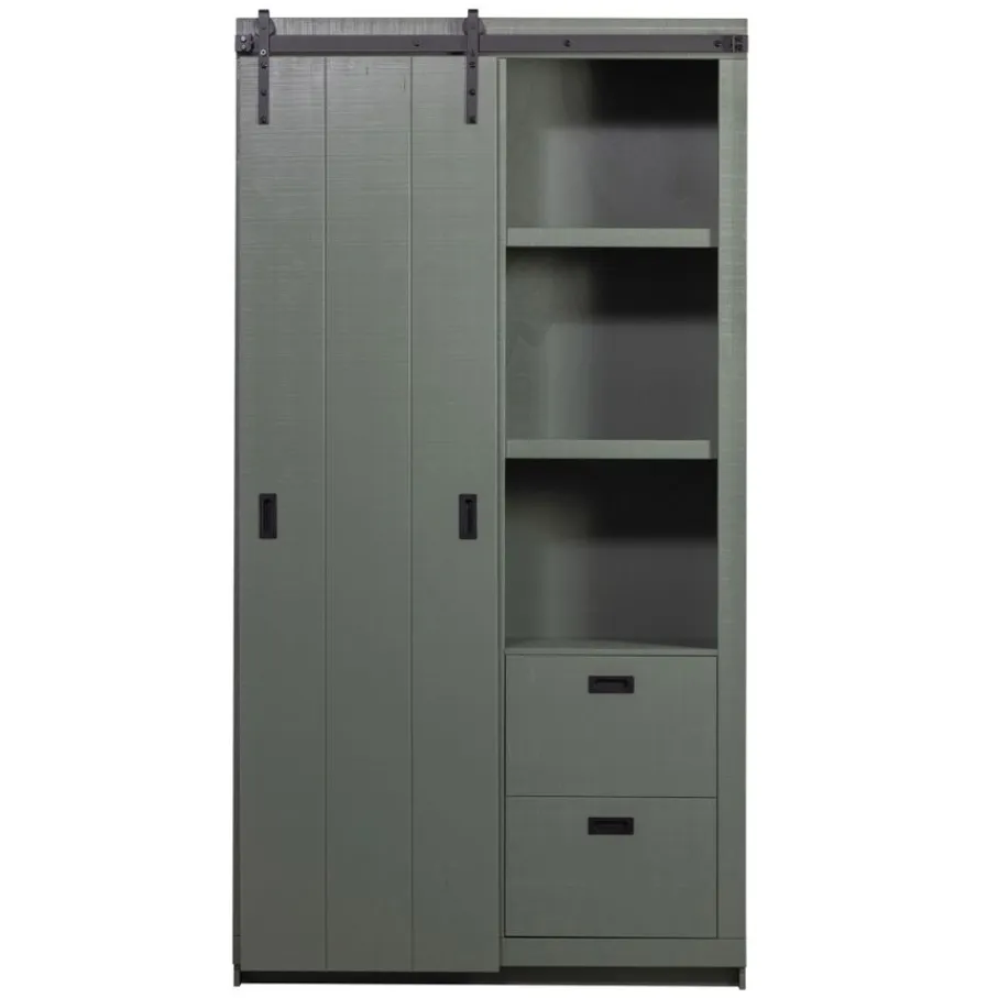 De schuifdeurkast heeft 4 dikke legplanken en aan de onderzijde 4 lades. De schuifdeur hangt aan een zwart metalen rails. Deze deur houdt één zijde altijd zichtbaar en de andere zijde afgedekt. De lades en deur zijn voorzien van zwart metalen cassette grepen.