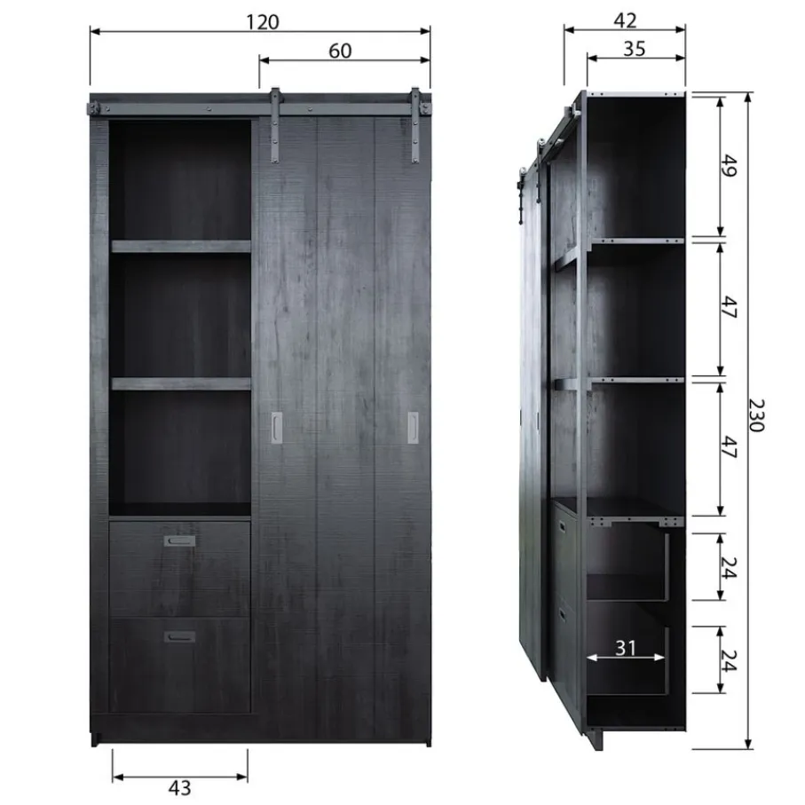 - Geef je interieur een stoere upgrade met deze unieke Barn kast, compleet met opvallend schuifdeursysteem en robuuste zwarte accenten voor een industriële touch.