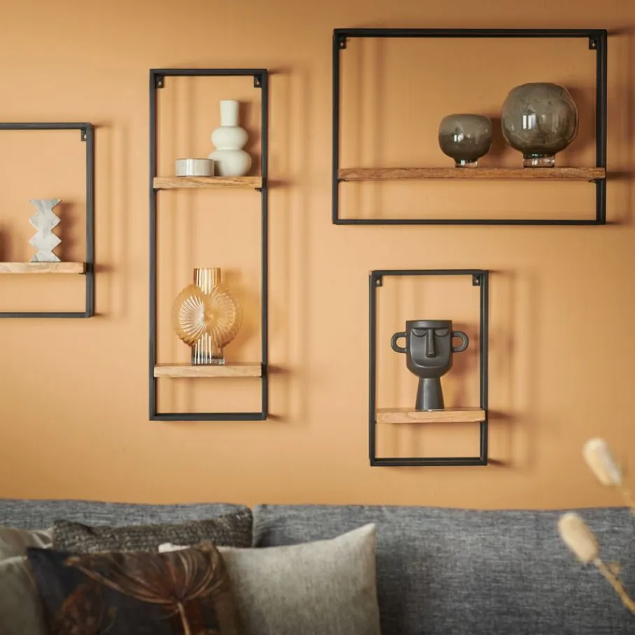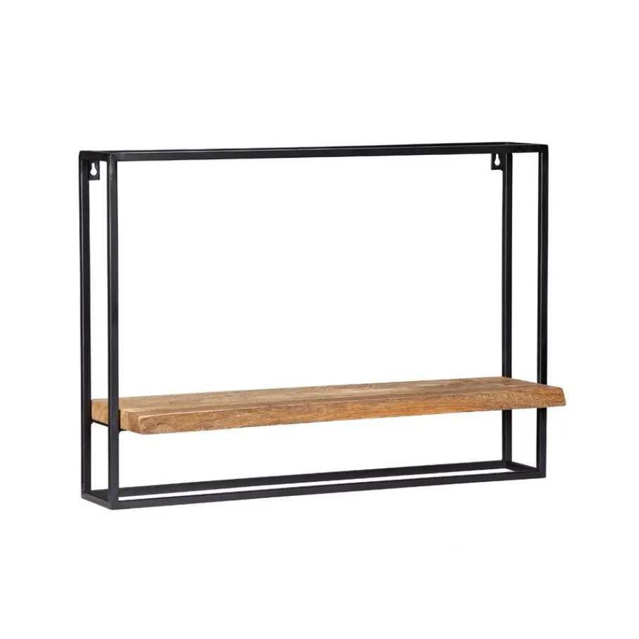 - Transformeer een saaie muur in een ware eyecatcher met de trendy combinatie van naturel mangohout en stoer zwart metaal.