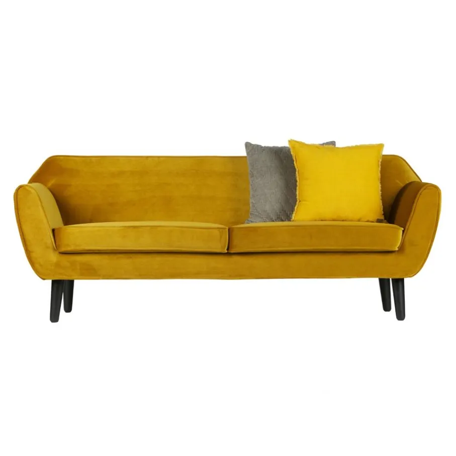 Bank Rocco is bekleed met een okergele velvet met een luxe uitstraling. De fluwelen stof voelt fijn aan en heeft een mooie, matte glans. Deze volle en zware kwaliteit velvet bestaat uit 100% polyester en heeft een Martindale van 100.000. Het materiaal is kleurvast en zal niet snel pillen en daarom is het geschikt voor intensief woongebruik.