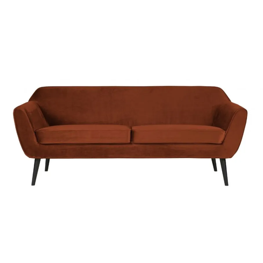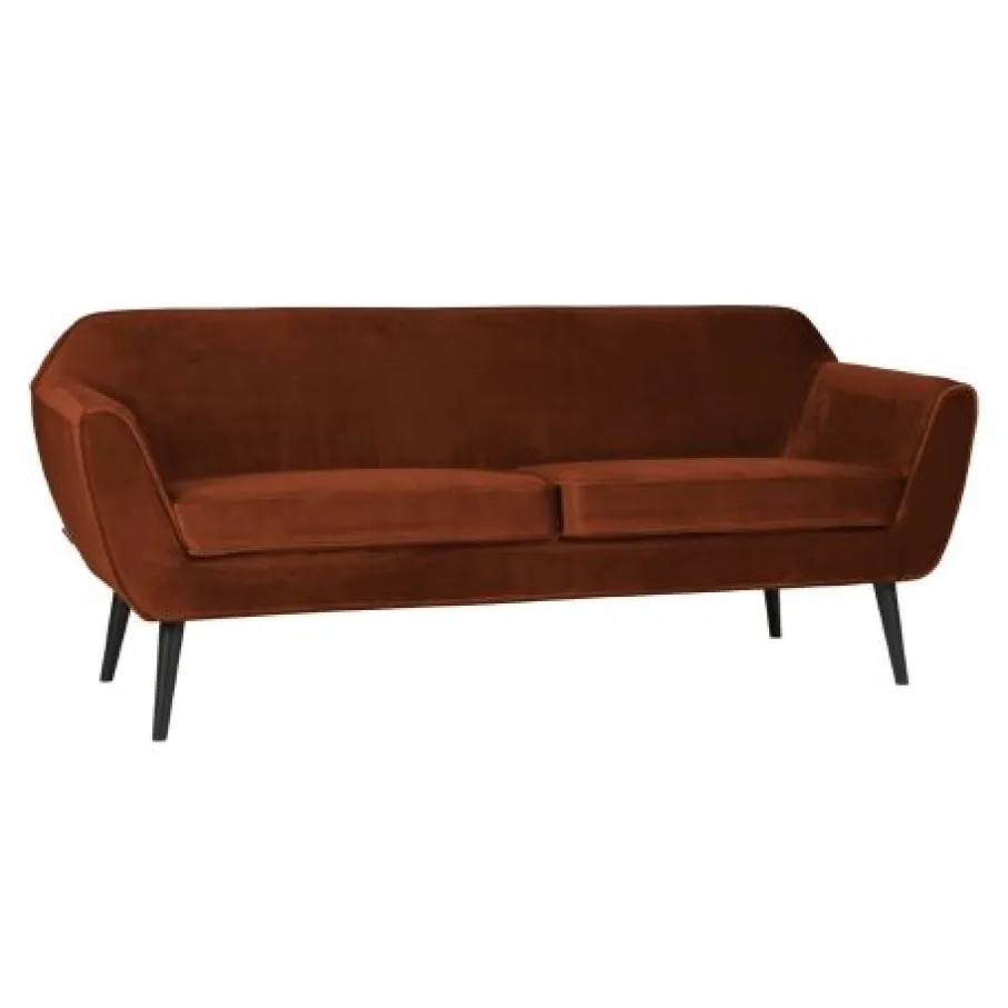 Bank Rocco is bekleed met een roestkleurige velvet, een warme roodbruine tint. De fluwelen stof voelt fijn aan en heeft een mooie, matte glans. Deze volle en zware kwaliteit velvet bestaat uit 100% polyester en heeft een Martindale van 100.000. Het materiaal is kleurvast en zal niet snel pillen en daarom is het geschikt voor intensief woongebruik.