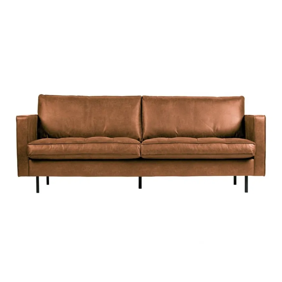 Deze Rodeo bank is bekleed met gerecycled leer in een cognacbruine kleur. Dit geeft een unieke look en is door het gebruik van restanten leer een duurzame keuze. Het bestaat voor 70% uit vezels van echt leer en voor 30% uit polyester. Dit zorgt voor een stevig materiaal met een fijn, zacht gevoel dat goed kleurvast is. Tijdens het gebruik zal het uiterlijk en de structuur van de stof zijn natuurlijke kenmerken meer laten zien, dit verandert niks aan de duurzaamheid en kwaliteit.
