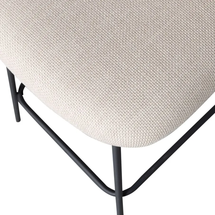 De stevige geweven bekleding van barkruk Kjeld is van 100% polyester. Dit materiaal blijft lange tijd in uitstekende staat door zijn dikte en weerstand tegen pilling. Door het strakke weefpatroon krijgt de beige stof een gemêleerd en driedimensionaal effect.