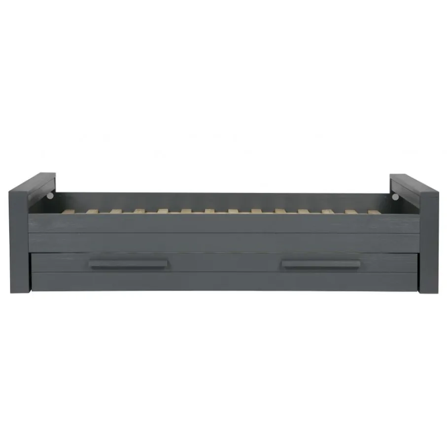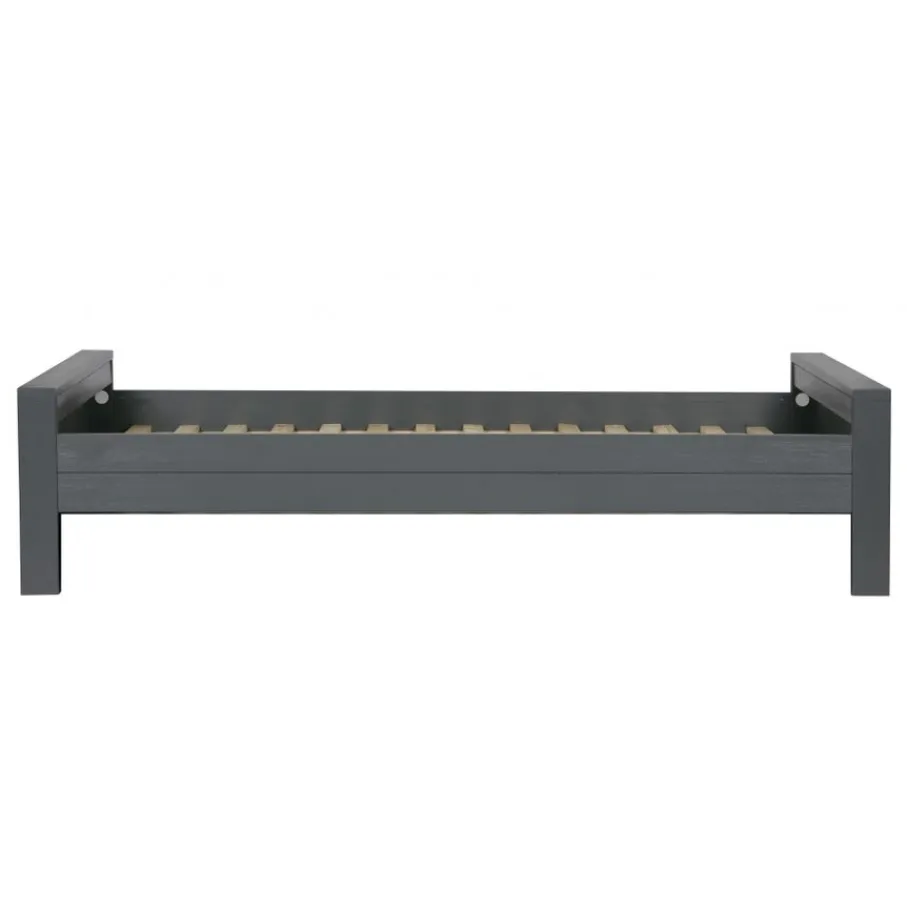 Het WOOOD Dennis bed is 219 cm breed, 95 cm diep en 53 cm hoog. Het is gemaakt van FSC gecertificeerd grenen met een geborstelde afwerking. Hierdoor worden oneffenheden, kleine scheurtjes en knoesten extra zichtbaar. Allemaal kenmerken van doorleefd hout en dit maakt ieder exemplaar uniek! Het donkergrijze bed wordt exclusief lattenbodem en matras geleverd en moet nog gemonteerd worden.