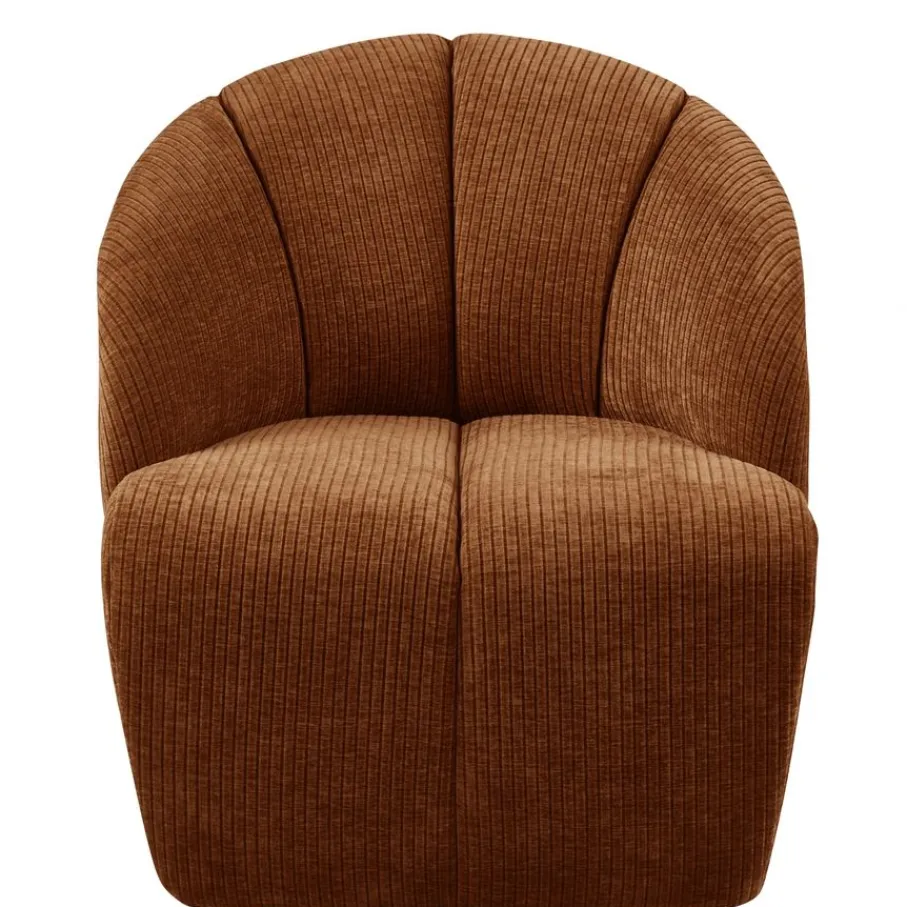 De fauteuil is bekleed met een moderne stof met een rijke textuur en een fluweelachtig uiterlijk. Deze roestbruine ribstof is aangenaam zacht en gemaakt van 100% polyester. Met een Martindale van 80.000 hoef je je geen zorgen te maken over krassen of pillen. TIP: Door af en toe te borstelen met een zachte textielborstel blijft de ribstof heerlijk zacht aanvoelen.