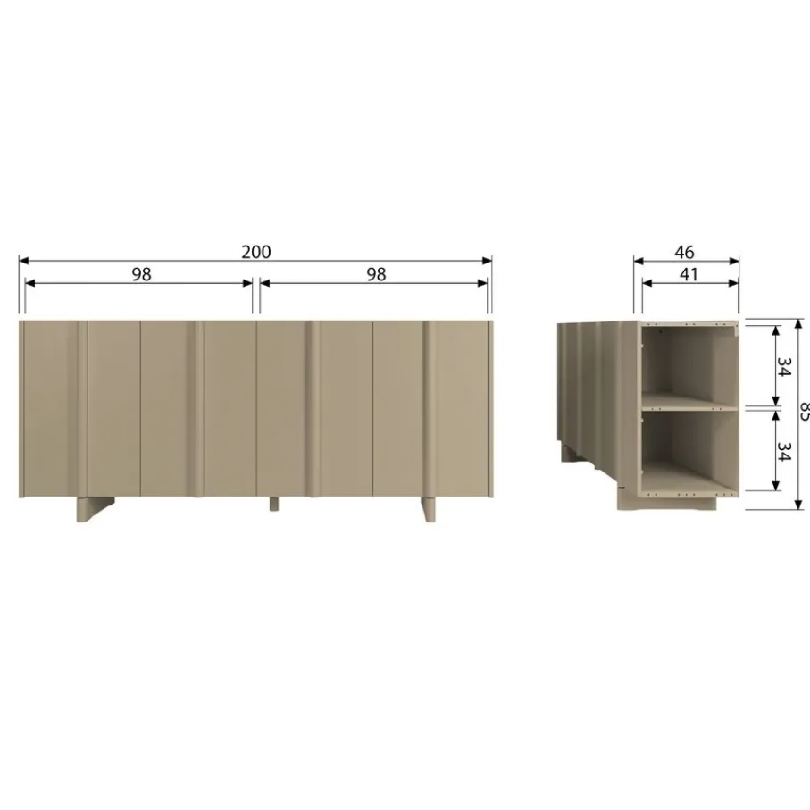 Het dressoir heeft twee vakken met dubbele deuren. In ieder vak zit een plank, waardoor er vakken ontstaan van 96 cm breed en 33 cm hoog. Elke plank heeft een draaggewicht van 15 kg. De bovenkant heeft een maximaal draaggewicht van 35 kg.