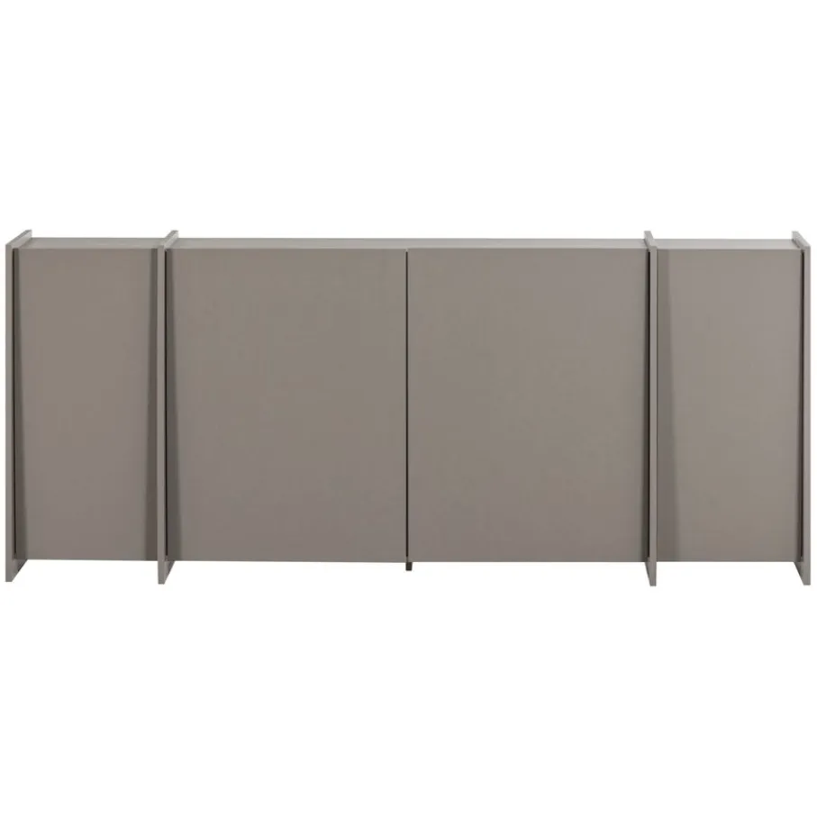 Achter de vier deuren bevinden zich vier ruime opbergvakken, elk voorzien van een legplank. Dit creëert een overzichtelijke en opgeruimde indeling voor al je spullen. De binnenzijde van de kast is afgewerkt met spaanplaat in een donkere kleur, wat een fraai contrast vormt met de warmgrijze buitenzijde.