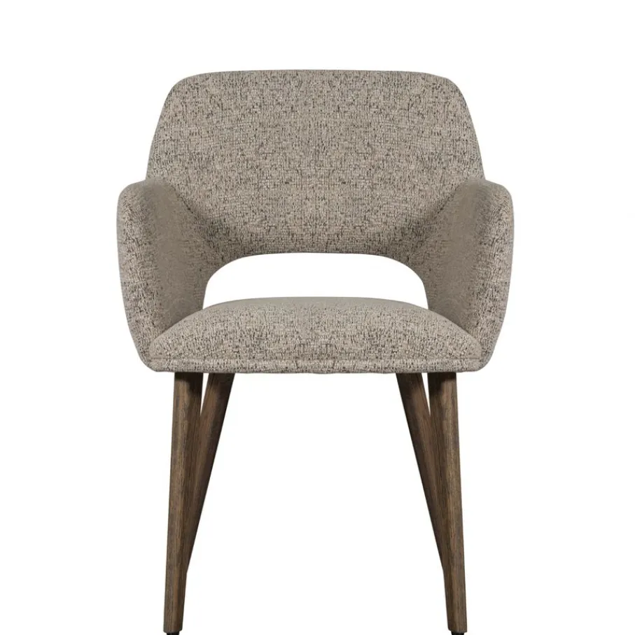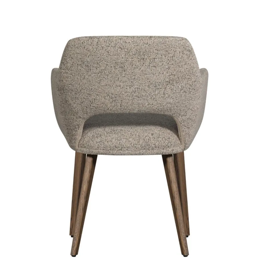 De armstoel is bekleed met een geweven chenille stof met een zachte grip. Bovendien is de stof voorzien van een matte glans die zorgt voor een luxueuze uitstraling. Het is gemaakt van 100% polyester en heeft een Martindale van 30.000. De stof is sterk en voelt comfortabel aan. De beige kleur is een gemêleerde tint die makkelijk combineert.