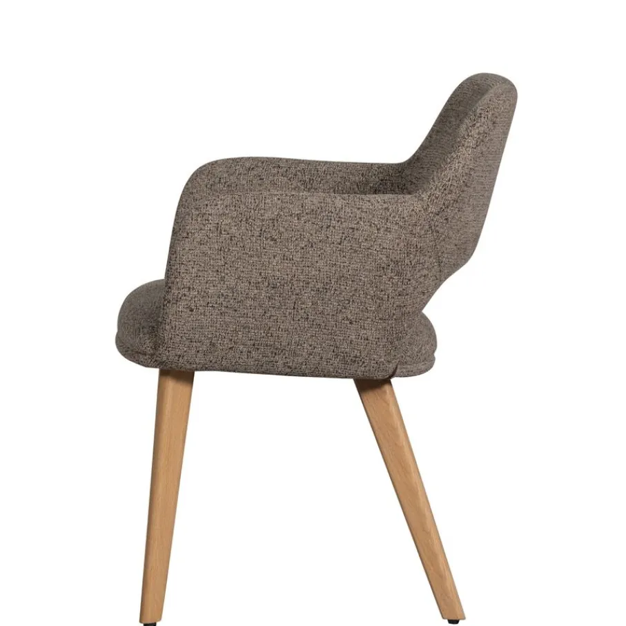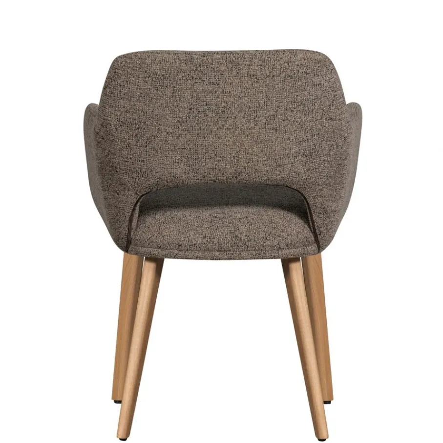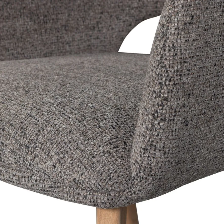 De armstoel is bekleed met een geweven chenille stof met een zachte grip. Bovendien is de stof voorzien van een matte glans die zorgt voor een luxueuze uitstraling. Het is gemaakt van 100% polyester en heeft een Martindale van 30.000. De stof is sterk en voelt comfortabel aan. De taupe kleur is een gemêleerde tint die makkelijk combineert.