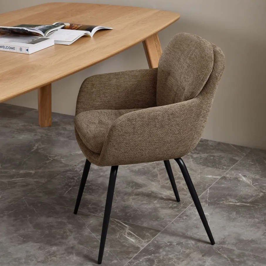 - Een echte blikvanger: Met z’n ronde design en luxe chenillestof brengt deze stoel direct een warme, trendy sfeer in huis.