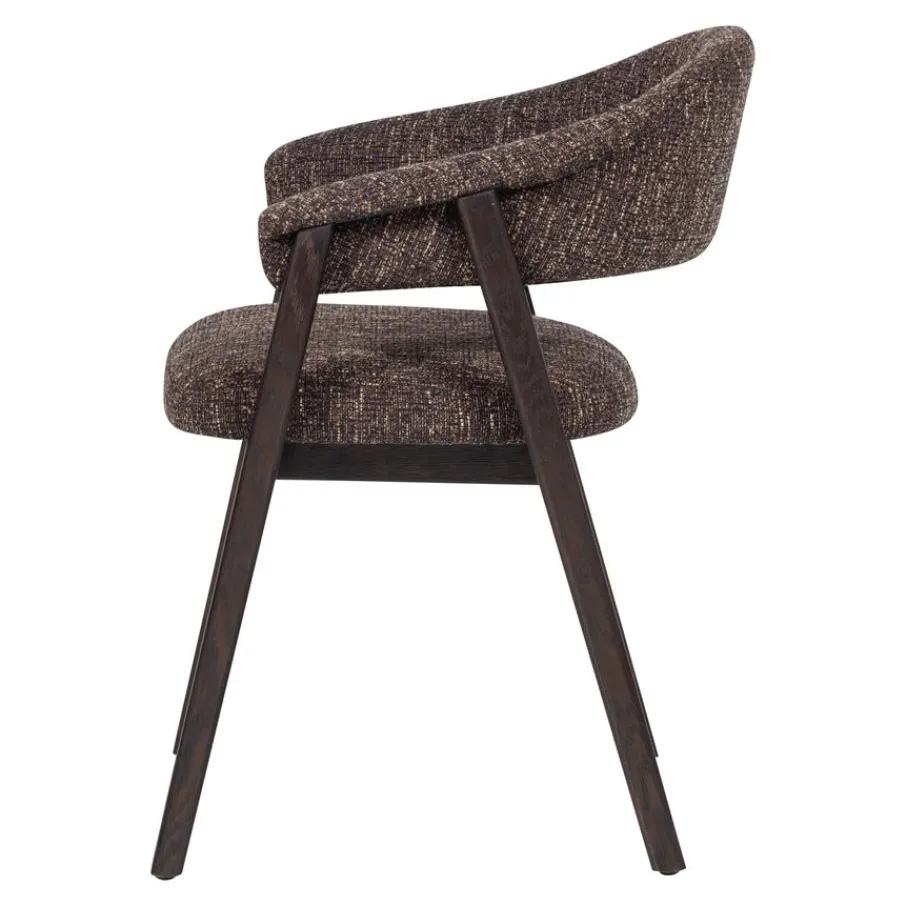 Eetkamerstoel Tunar van WOOOD brengt karakter en een rustige basis in de eetkamer. Het ontwerp kenmerkt zich door de vloeiende lijn van de rugleuning die overgaat in de armleuningen. Het frame van FSC-gecertificeerd eikenhout, met zijn zichtbare nerftekeningen, geeft elke stoel een unieke uitstraling. Dankzij dit toegankelijke design past eetkamerstoel Tunar in diverse woonrstijlen en creëert hij een uitnodigende sfeer aan de eettafel.