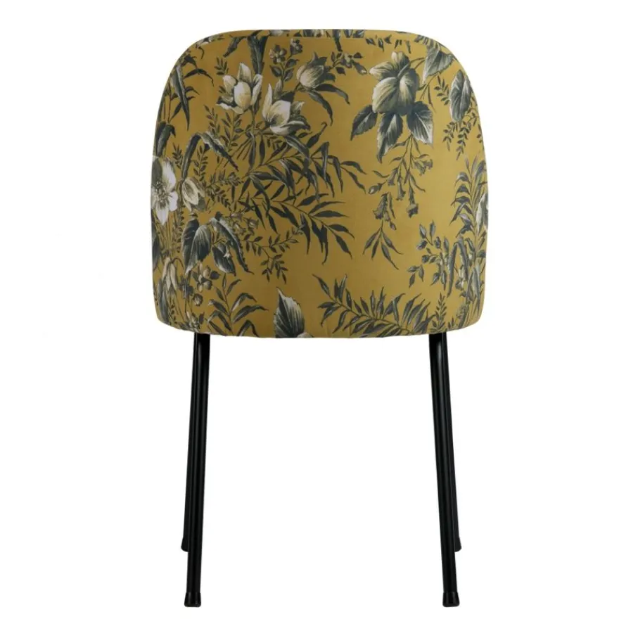 Deze mooie stoel is bekleed met een zachte velvet stof in de kleur Poppy Mustard, een okergele kleur met een multi color bloemenprint. De stof is gemaakt van 100% polyester, een stof die niet snel verkleurt of verslijt.