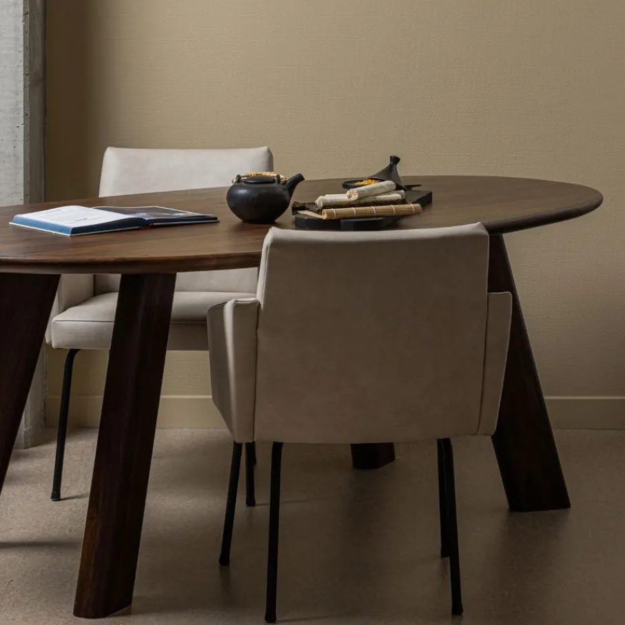 - De organische vorm vraagt om ruimte: Deze charmante tafel komt het mooist tot zijn recht in een eethoek waar de vorm vrijuit kan ‘ademen’ en de elegantie volledig tot zijn recht komt.