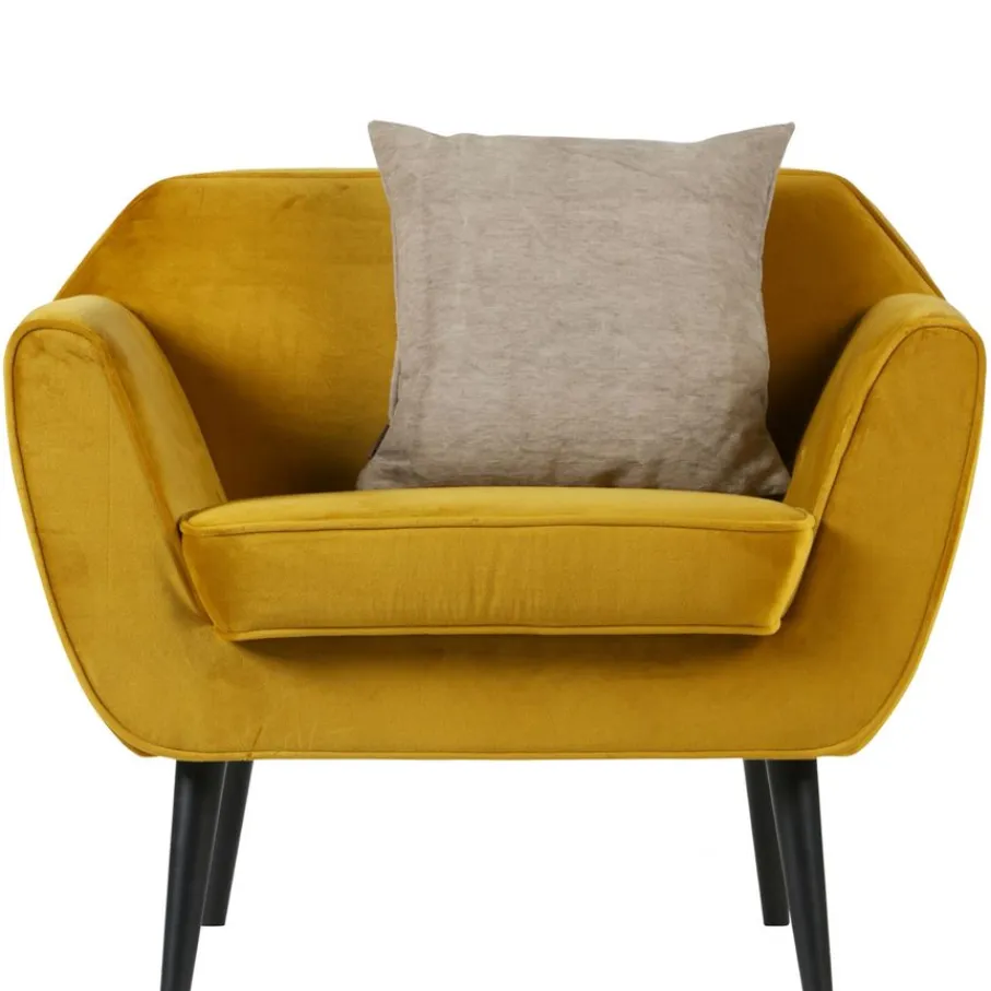 Fauteuil Rocco is bekleed met een okergele velvet met een luxe uitstraling. De fluwelen stof voelt fijn aan en heeft een mooie, matte glans. Deze volle en zware kwaliteit velvet bestaat uit 100% polyester en heeft een Martindale van 100.000. Het materiaal is kleurvast en zal niet snel pillen en daarom is het geschikt voor intensief woongebruik.