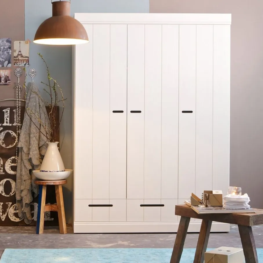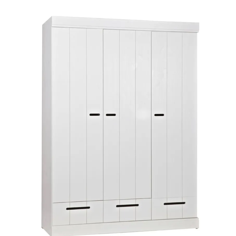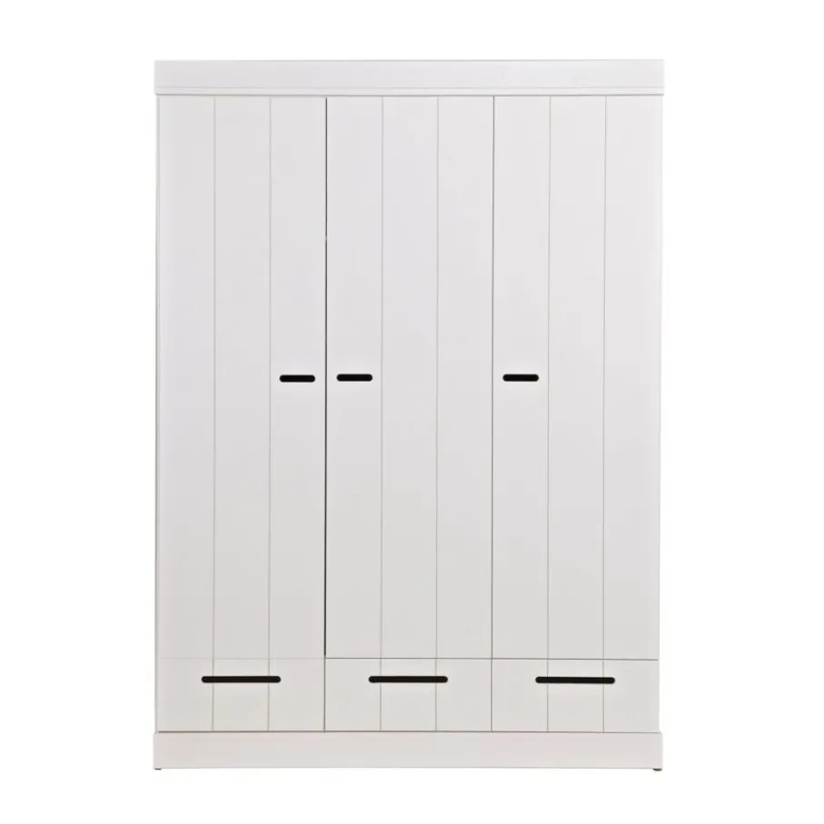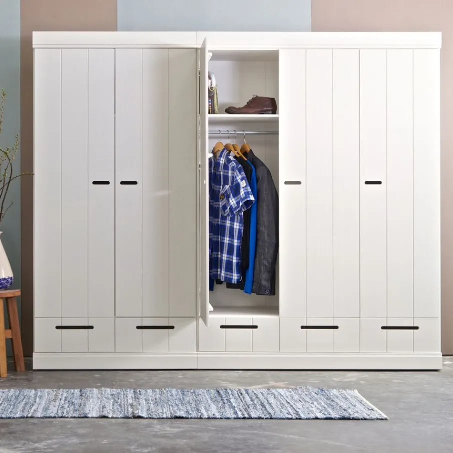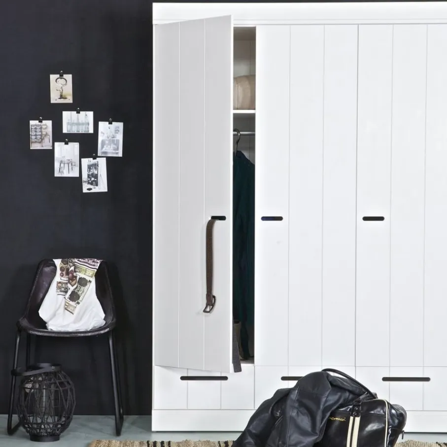 Aan de linkerzijde van de kast zit het dubbeldeurs gedeelte. Hierachter zit een plank en eronder een roede voor hangkleding. Aan de rechterzijde zit een enkeldeurs gedeelte met 3 legplanken en onderin zitten 3 laden voor extra opbergruimte. Voor het dubbeldeurs gedeelte aan de linkerzijde is ook een extra Connect kastindeling leverbaar. Die zorgt voor een halvering van de breedte van de roede en voegt 2 smalle legplanken toe.