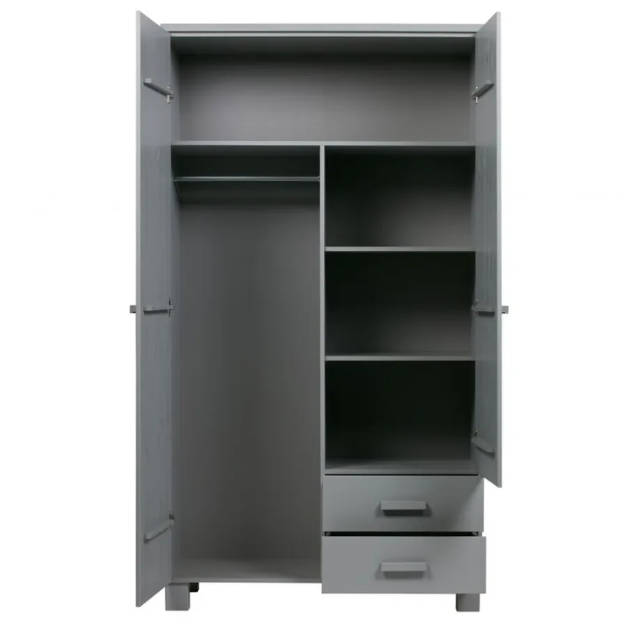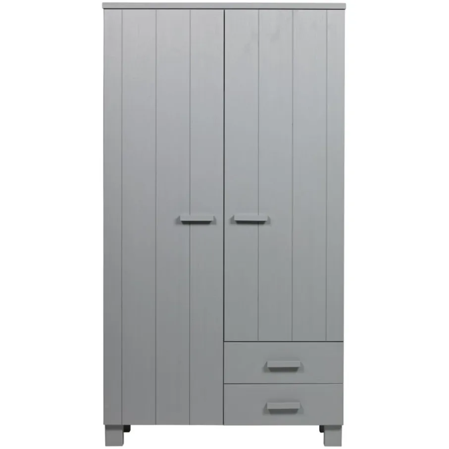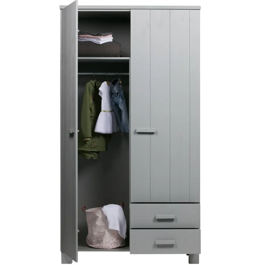 Kledingkast Dennis is, inclusief de handgrepen, gemaakt van grenen met een geborstelde afwerking. Hierdoor worden oneffenheden, kleine scheurtjes en knoesten extra zichtbaar. Allemaal kenmerken van doorleefd hout en dit maakt ieder exemplaar uniek!
