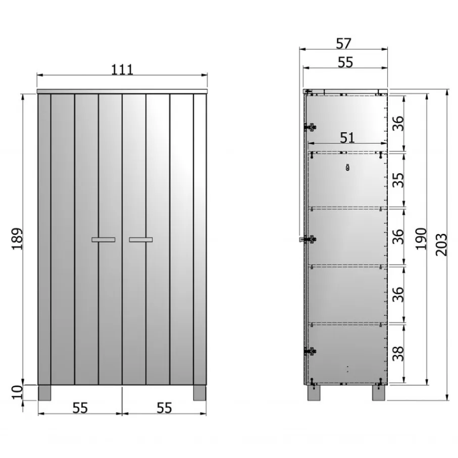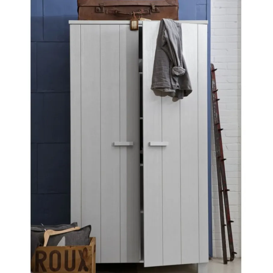 Kledingkast Dennis is, inclusief de handgrepen, gemaakt van grenen met een geborstelde afwerking. Hierdoor worden oneffenheden, kleine scheurtjes en knoesten extra zichtbaar. Allemaal kenmerken van doorleefd hout en dit maakt ieder exemplaar uniek!