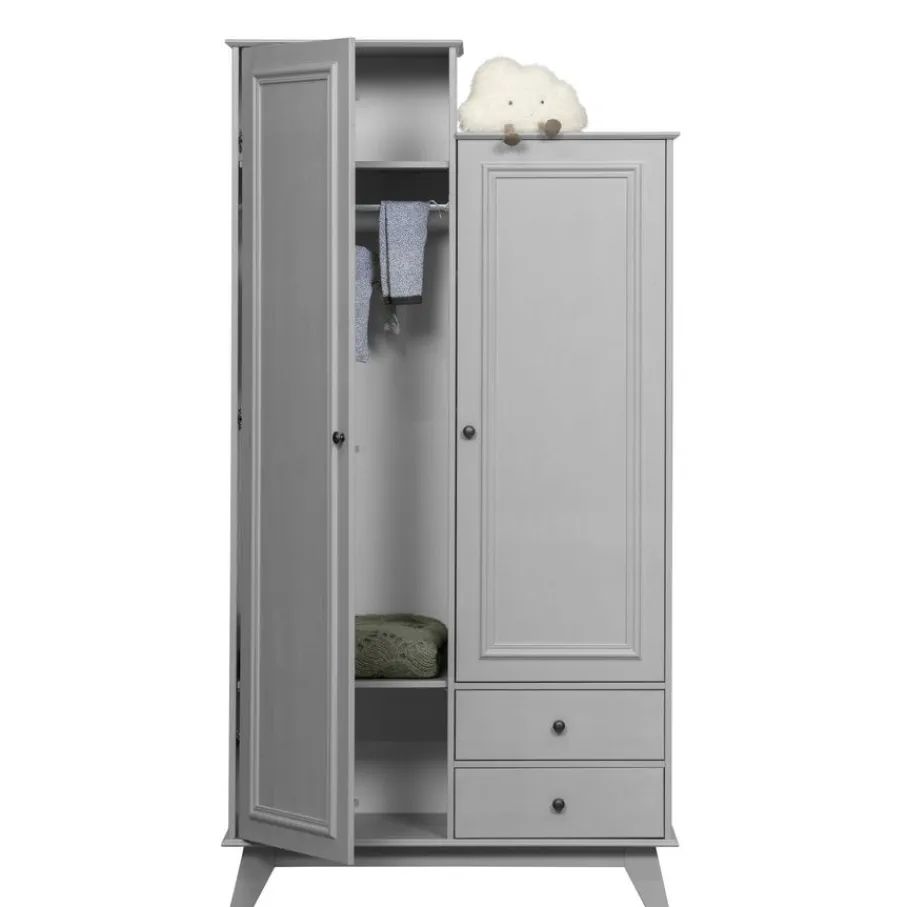 De kast is voorzien van 2 lades en 2 deuren, allen met een zwart metalen knop greep. Het linker vak heeft er een hanggedeelte in en rechts zit een vak met 3 legplanken.