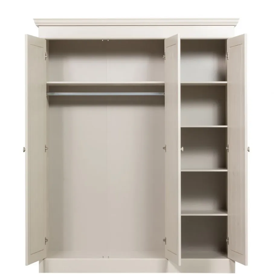 Deze stijlvolle kast heeft lekker veel opbergruimte met een hang en leg gedeelte. Het hanggedeelte is 101 cm breed en 146 cm hoog. Aan de rechterkant zitten handige opbergvakken van 52 cm breed en 35 cm hoog. Het is mogelijk om van deze kast een volledige legkast te maken. Hiervoor is er een Olivia set legplanken leverbaar. Met deze plankenset wordt het hang gedeelte van de kledingkast opgevuld met drie planken.
