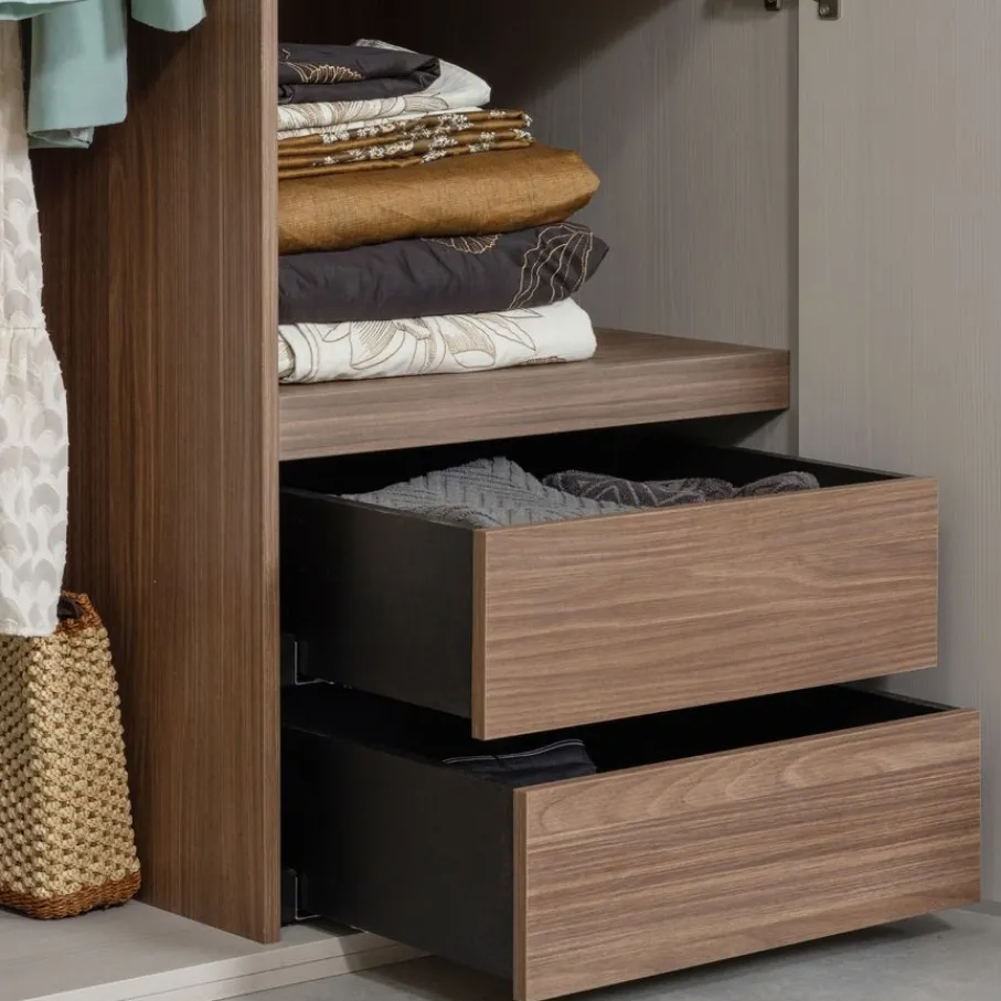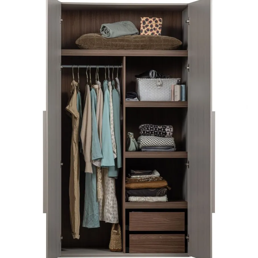 De Rens kast heeft 2 slanke deuren over de hele lengte. Daarachter bevinden zich een hanggedeelte en een gedeelte met legplanken en 2 lades. De soepele lades bieden handige ruimte voor bijvoorbeeld ondergoed en accessoires. Ze hebben een afmeting van 48×48 cm en zijn elk 13 cm hoog. Het royale hanggedeelte is 53 cm breed en 155 cm hoog. Het interieur is afgewerkt met een luxe decor van bruin notenhout.