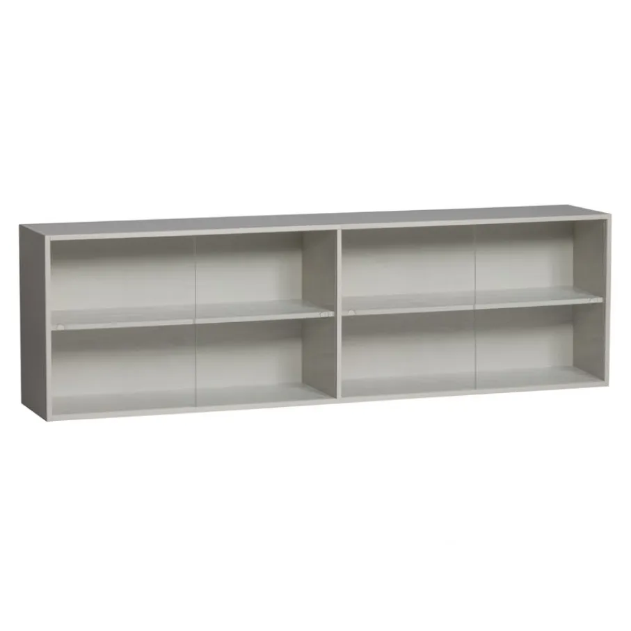 De opzetkast heeft links en rechts een vak. De vakken worden afgesloten met glazen schuifdeuren van gehard, transparant glas.